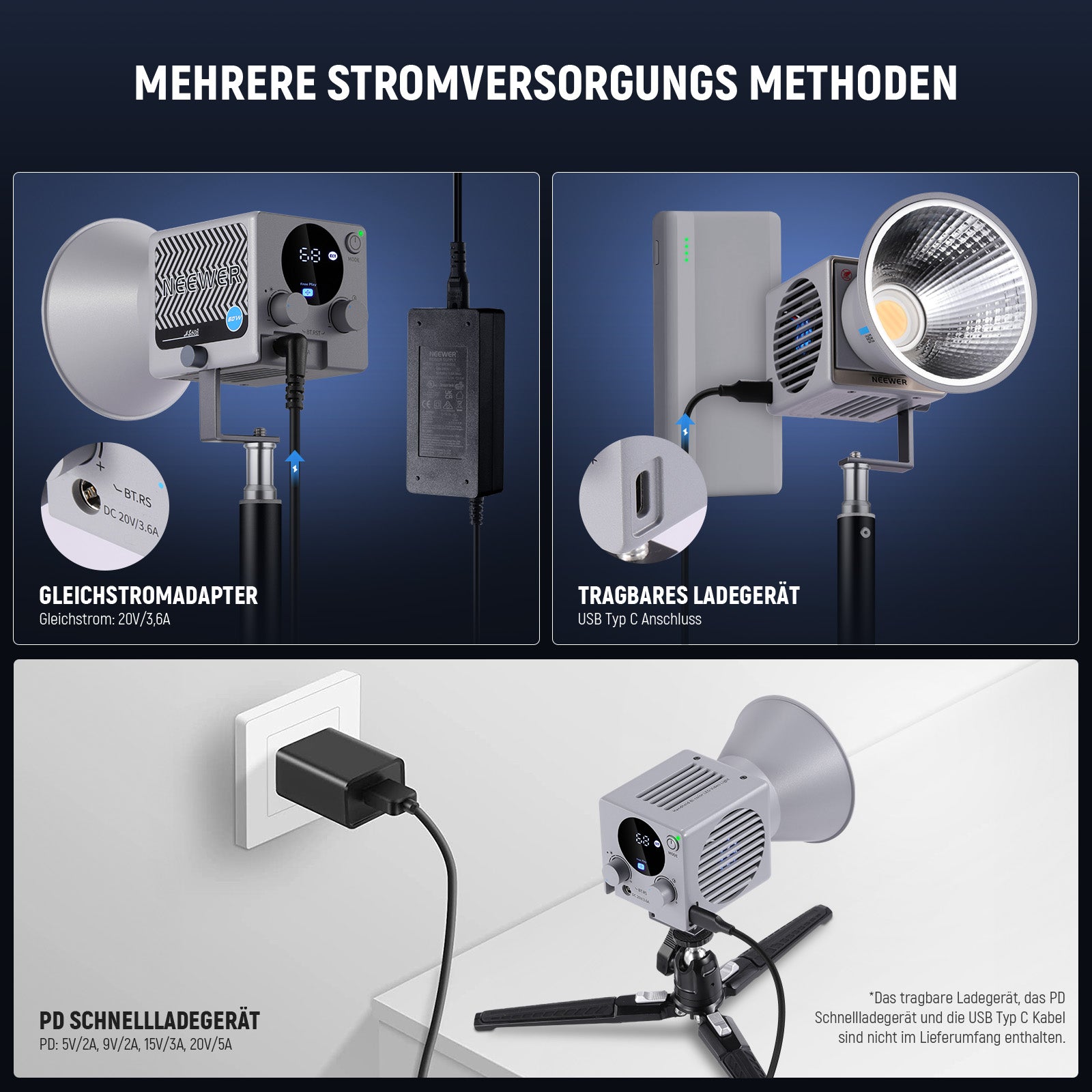 - Verschiedene Stromversorgungslösungen- Schließen Sie HS60B Video Licht mit dem Gleichstromadapter an eine Steckdose an, um den ununterbrochenen Einsatz in Innenräumen zu ermöglichen. Für Außenaufnahmen können Sie die HS60B mit einem tragbaren 65W PD Ladegerät (nicht enthalten) über den USB Typ C Anschluss mit Strom versorgen. Sie können unsere Akkuplatte PS010E NP-F970, den V Montage Akku PS099E und die V Montage Akkuplatte PS006 separat als Stromversorgungslösungen für den Außenbereich erwerben