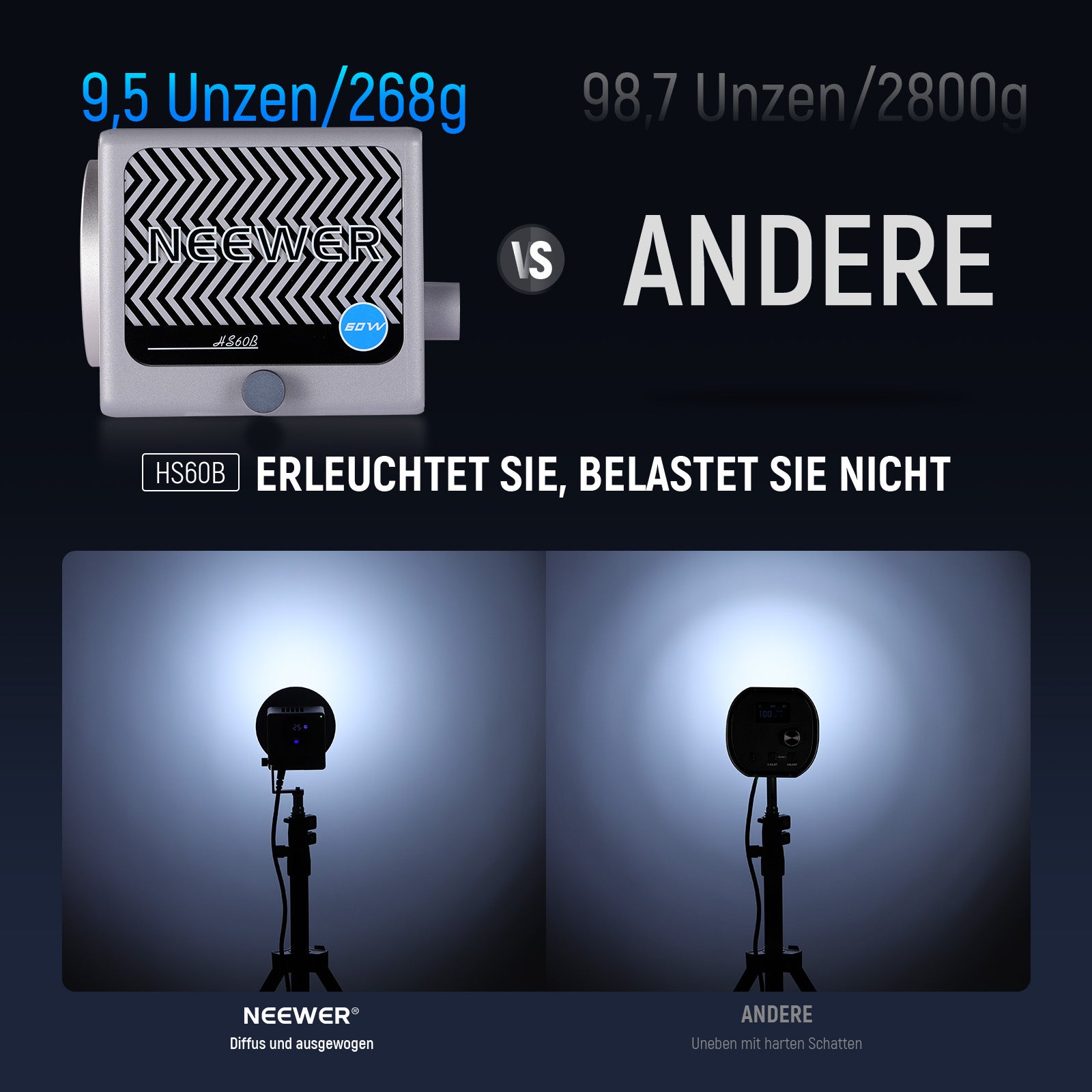 - Vielseitige und flexible Lichtformer- HS60B Fotolicht verwendet die kleine NEEWER Halterung und verfügt über einen Reflektor zur Strahlkonzentration und Helligkeitsverbesserung. Ein mitgelieferter Silikondiffusor kann die Lichtquelle weicher machen und für individuelle Lichtverteilung geformt werden. Sie können unser Tischstativ TP29 separat erwerben, um das HS60B über seine L-förmige Halterung zu unterstützen