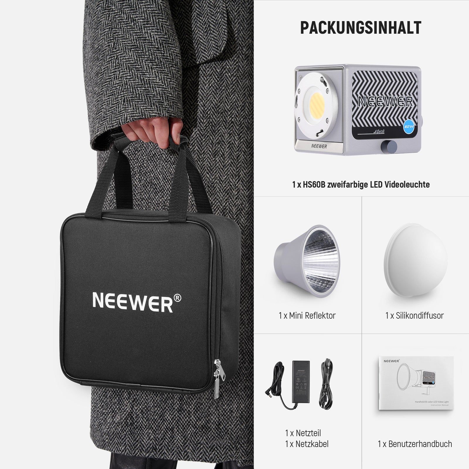 Handheld Mini LED Video Light- Bei 3.8„ x 3.8“ x 5.7"/96 x 96 x 145mm und 11.3oz/320g (mit Reflektor), kann dieses Mini tragbare LED-Video-Licht für die Fotografie Beleuchtung in Ihrer Handfläche passen und leicht von einem Ort zum anderen zu übertragen. NEEWER HS60B Beleuchtungs-Kit kann als Schlüssel Licht oder Füllung Licht für Kamera-Foto-Shooting, Studio-Porträts, Fotoshootings, Podcast-Videografie, Filmen, Outdoor-Interviews, Live-Streaming, Hochzeitsfotografie, Vlogging, und mehr verwendet werden