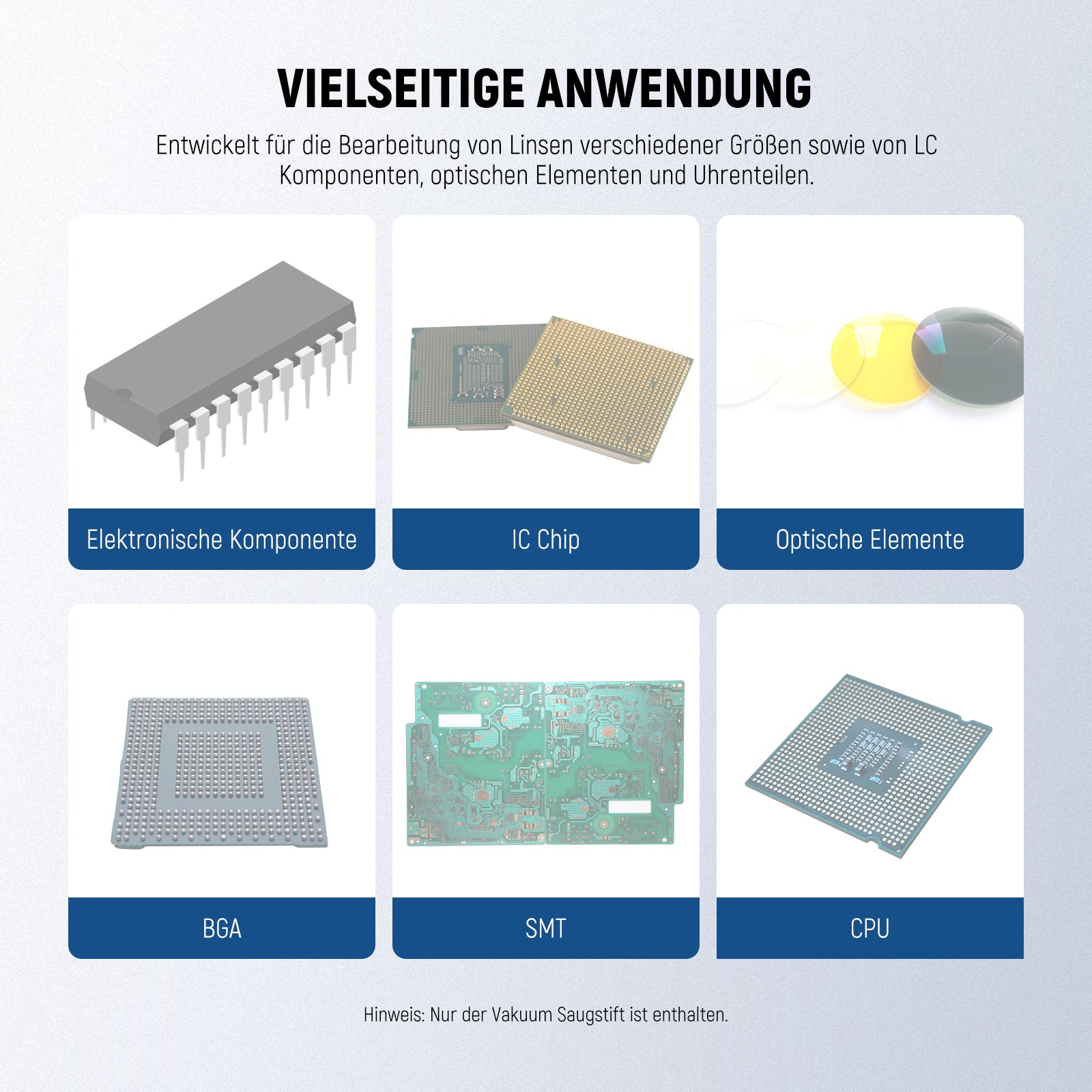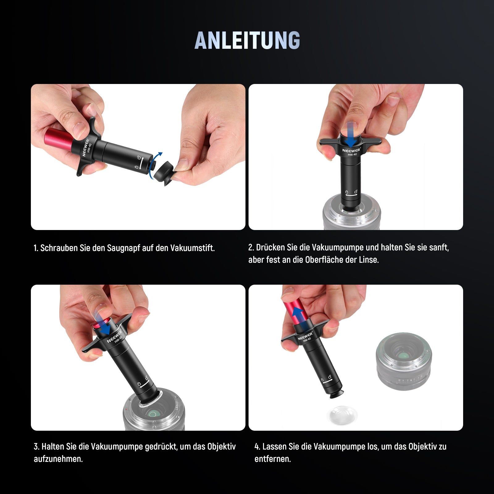 - Hohe Vakuum Saugleistung- Der Vakuumstift und die Saugnäpfe bieten eine ausreichende Saugkraft. Drücken Sie die Vakuumpumpe, um die Oberfläche des Objektivs anzusaugen, heben Sie es vorsichtig auf und lassen Sie es dann los, damit das Objekt in die richtige Position fällt. Hinweis: Halten Sie die Pumpe während des gesamten Prozesses gedrückt, um eine sichere Absaugung zu gewährleisten