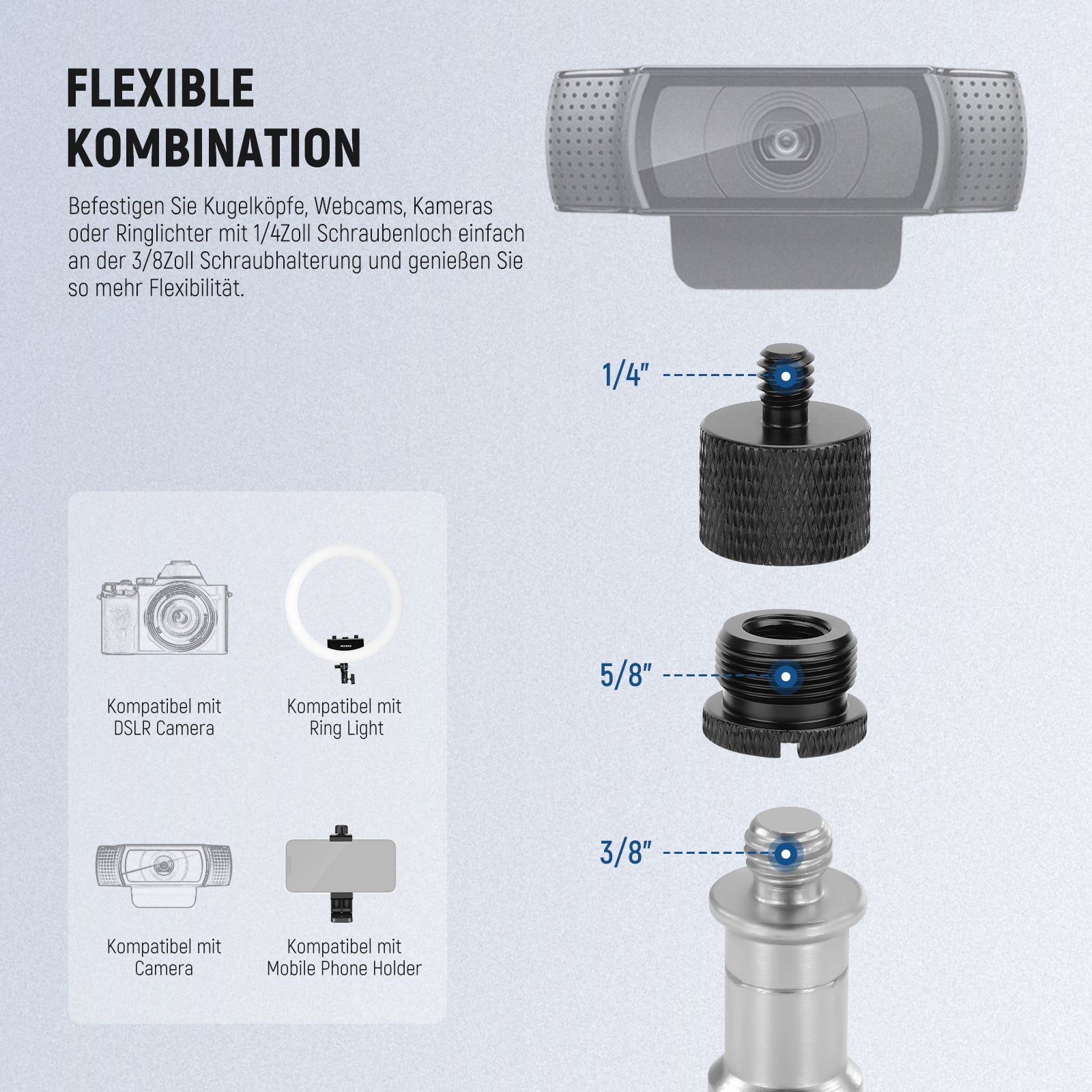 - Mic Stand Adapter Zubehörset- Enthält jeweils zwei Adapter von 3/8Zoll Innengewinde auf 5/8Zoll Außengewinde, 1/4Zoll Innengewinde auf 5/8Zoll Außengewinde, 5/8Zoll Innengewinde auf 1/4Zoll Außengewinde und 5/8Zoll Innengewinde auf 3/8Zoll Außengewinde. Gewindeadapter ermöglichen einfache Verbindung zwischen Mikrofonen und Mikrofonständern oder Galgenarmen und können kombiniert werden, um Kameras Handyhalterungen Action Cam Adapter oder Ringleuchten auf Stativen oder Lichtständern zu befestigen