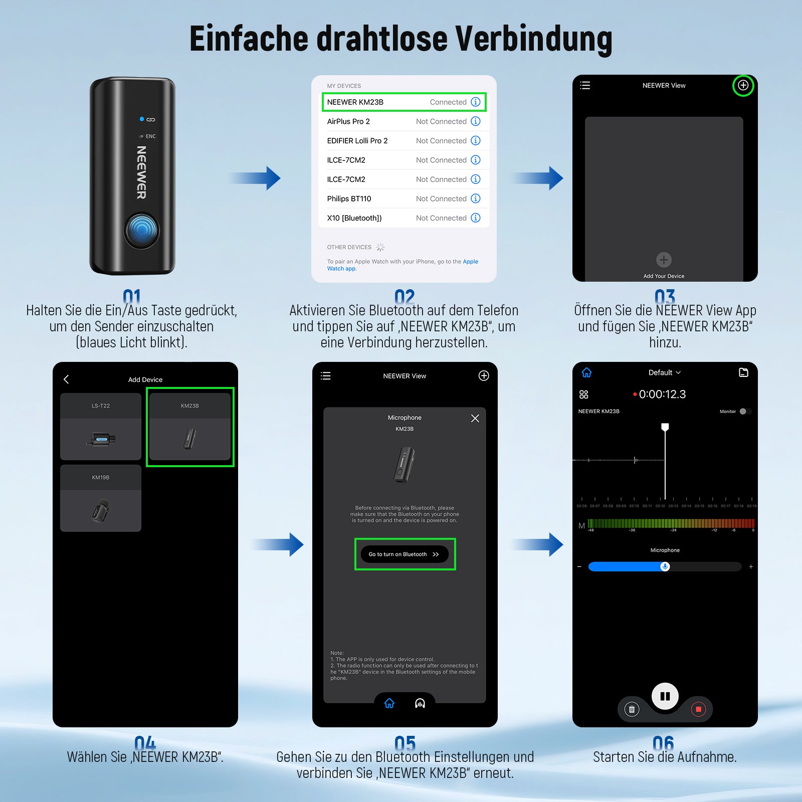 - Drahtlose Verbindung- Schalten Sie das Mikrofon ein und verbinden Sie dann „KM23B“ in den Bluetooth Einstellungen Ihres Telefons. Öffnen Sie die NEEWER View App, um die Verbindung zu bestätigen. Nehmen Sie mit der App auf oder lassen Sie sie im Hintergrund laufen, während Sie andere Apps verwenden. Um den Ton über den Lautsprecher wiederzugeben, trennen Sie die Bluetooth Verbindung