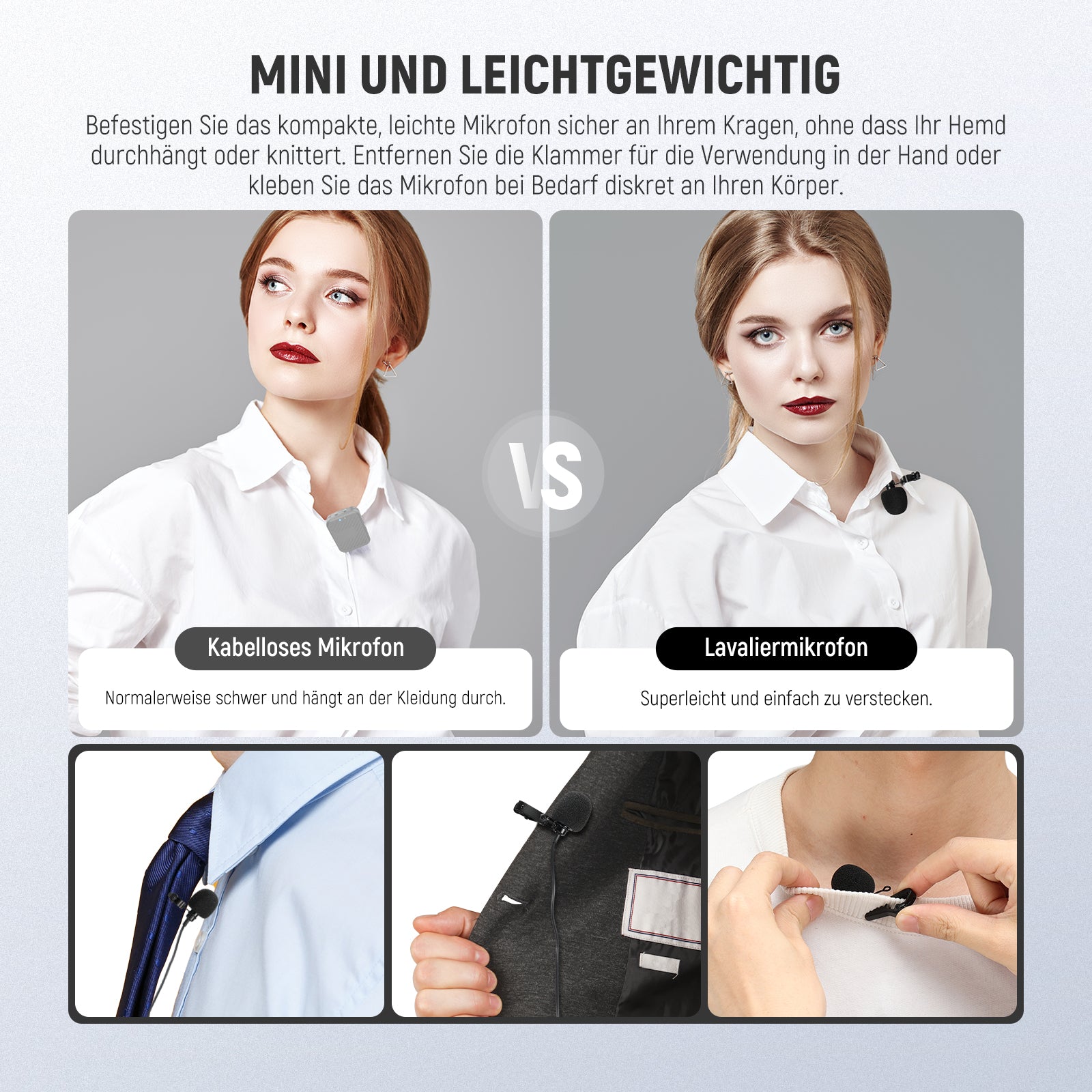 - Sicherer und abnehmbare Kragenklammer- Befestigen Sie das kleine, leichte Mikrofon sicher an Ihrem Kragen, ohne dass Ihre Hemden durchhängen oder zerknittern. Entfernen Sie die Klammer für die Verwendung in der Hand oder kleben Sie das Mikrofon bei Bedarf diskret an Ihren Körper