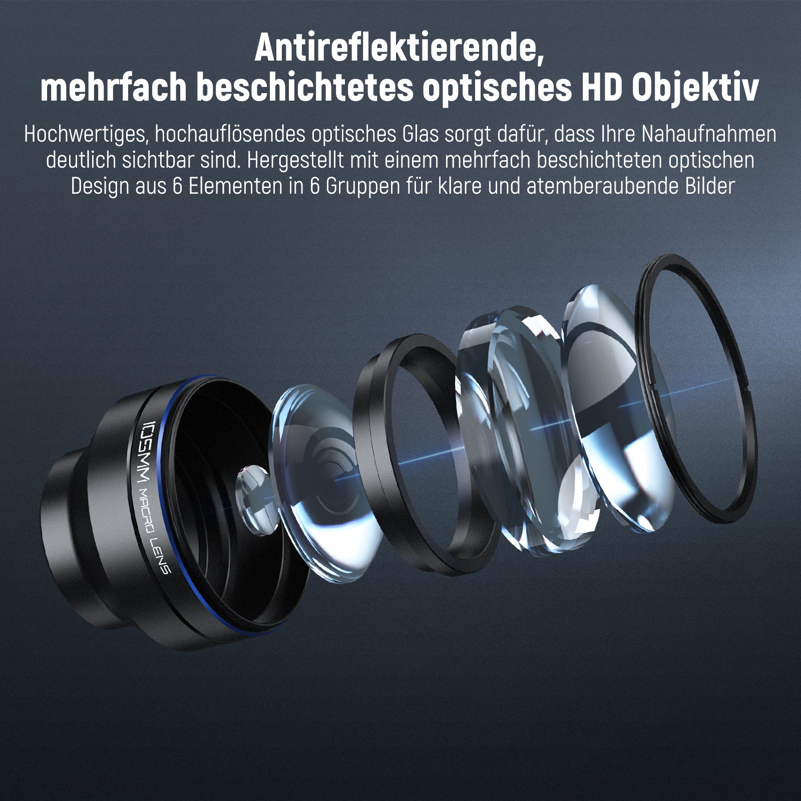 - Antireflektierendes, mehrfach beschichtetes optisches HD Objektiv- Das hochwertige High Definition optische Glas sorgt für eine hohe Klarheit Ihrer Nahaufnahmen. Hergestellt mit einem mehrfach beschichteten optischen Design aus 6 Elementen in 6 Gruppen für klare und atemberaubende Bilder