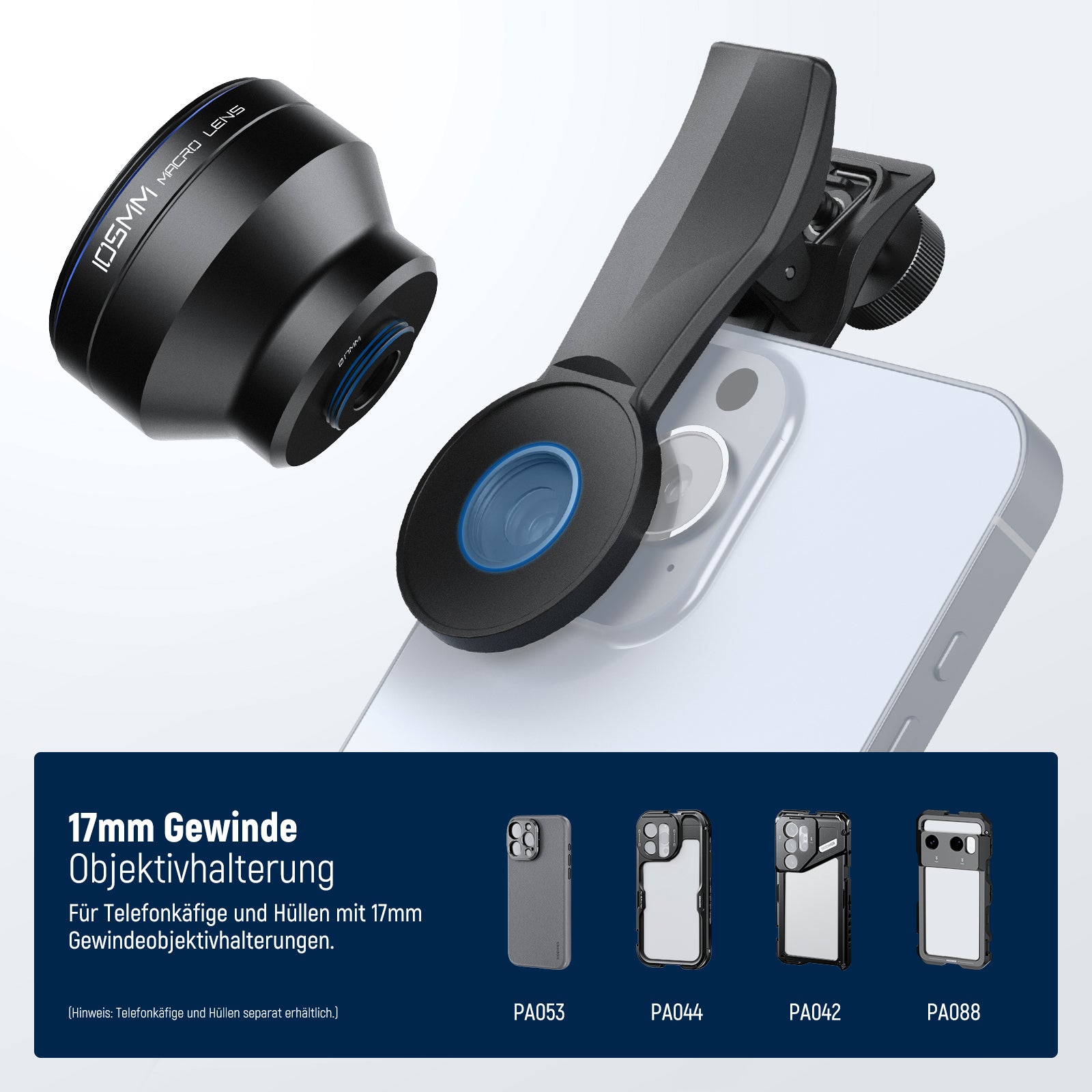 - 17mm Gewinde Telefonobjektiv Clip- Der Telefonobjektiv Clip kann das Objektiv sicher anschließen und ist kompatibel mit iPhone 16 15 Pro Max Samsung Galaxy S24 Ultra und anderen Smartphones. Das Objektiv ist auch für NEEWER Telefonkäfige, Telefonhüllen und Rückplatten mit 17mm Gewinde geeignet