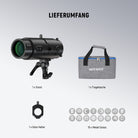 Lieferumfang und Bedienungsanleitung- Enthält 1 x Spotlight, 16 x Gobo, 1 x Gobohalter und 1 x Tragetasche. Hinweise: 1) Verwenden Sie immer eine Lampe mit einer Nennleistung von 300W oder weniger. 2) Schalten Sie das Licht alle 30 Minuten aus und lassen Sie es 5 Minuten abkühlen. 3) Um Verbrennungen zu vermeiden, tragen Sie beim Umgang mit dem Spotlights während und nach dem Gebrauch Schutzhandschuhe