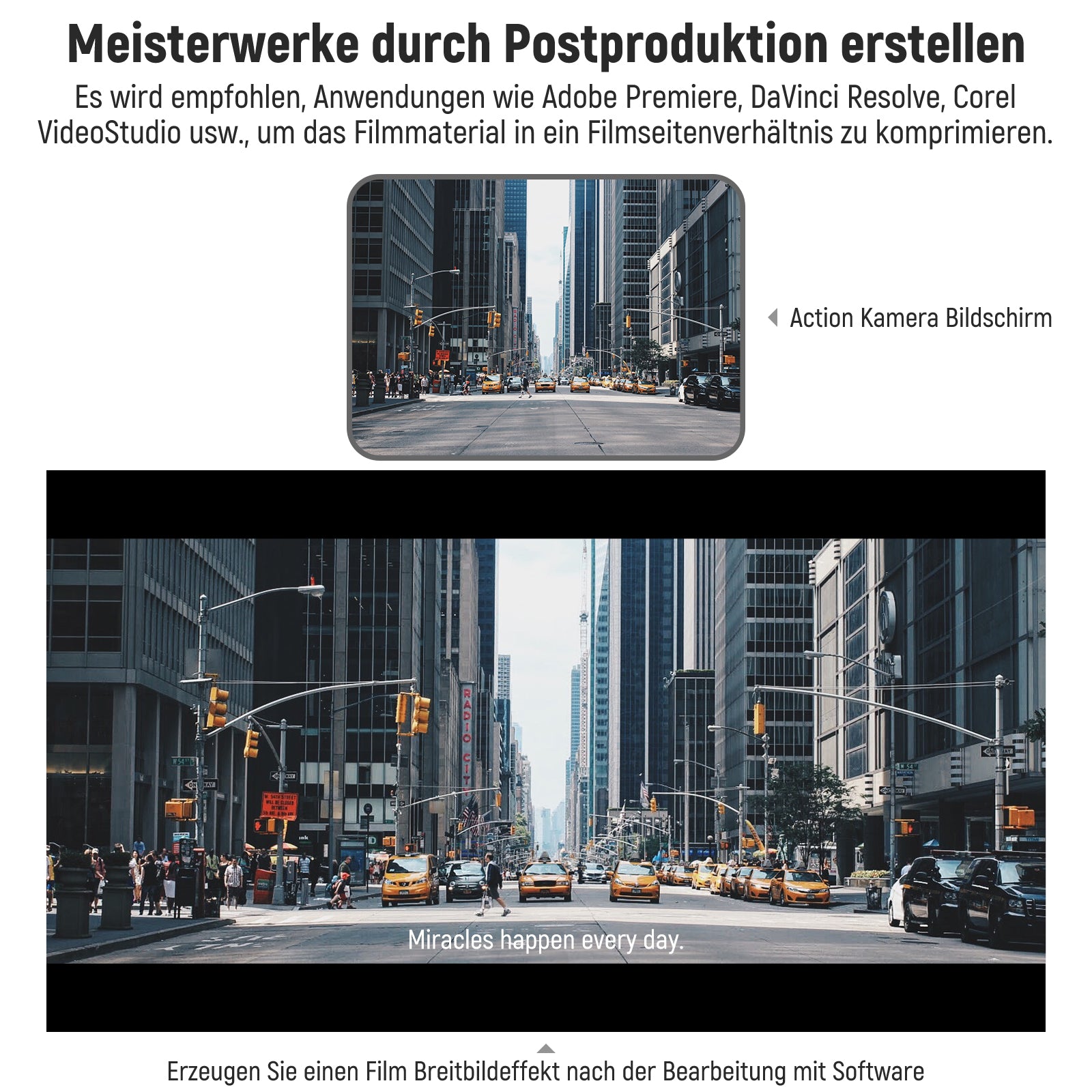 - 【Verwendung mit der Kamera App】 Verwenden Sie eine Kamera App, um das von Ihrer Action Kamera aufgenommene Material in ein filmisches Seitenverhältnis zu bringen. Andernfalls kann kein Breitbildschirm direkt generiert werden. Empfohlen für die Verwendung von Adobe Premiere, DaVinci Resolve, Corel VideoStudio usw.