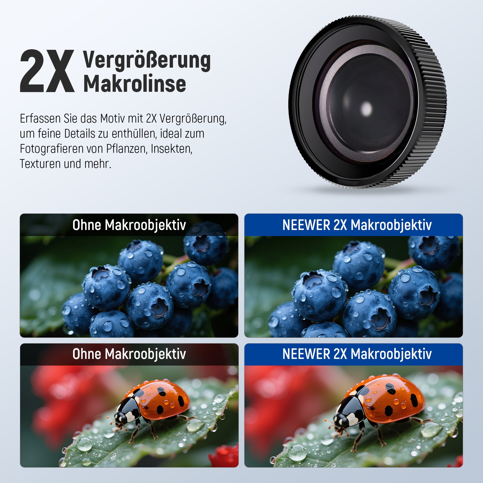 - Makroobjektiv mit 2X Vergrößerung- Erfassen Sie Ihre Motive mit 2 facher Vergrößerung und entdecken Sie feinste Details in einer Entfernung von 3-4cm (viel kürzer als die minimale Fokussierentfernung von Standardobjektiven), perfekt zum Fotografieren von Pflanzen, Insekten, Texturen und mehr
