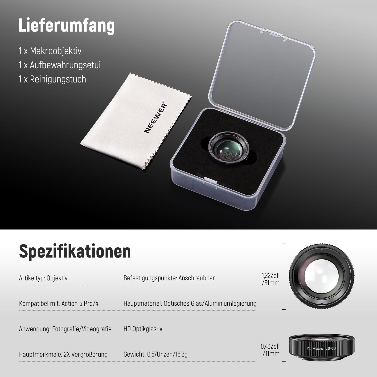 NEEWER LS-68 2X Makro Objektiv für DJI Osmo Action 5 Pro & Action 4