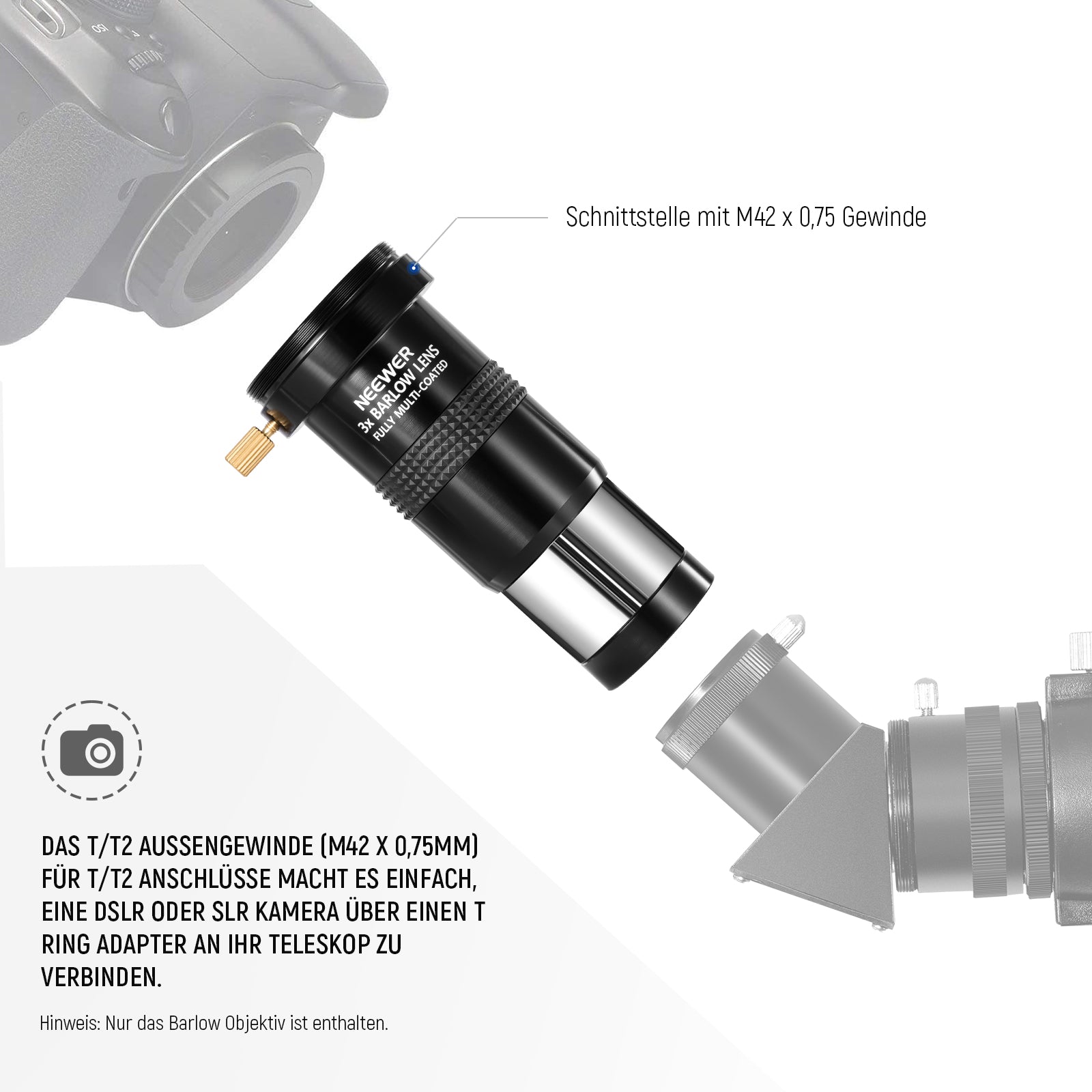 - 【Einfach zu bedienen mit M42 x 0,75 Gewinde】 Platzieren Sie einfach das 3X Barlow Objektiv zwischen Ihrem 1,25" Okular und Ihrem Teleskop, um die Vergrößerung zu verdreifachen. Sein T/T2 Außengewinde (M42x0,75mm) für T/T2 Anschlüsse verbindet eine DSLR Kamera einfach über einen T Ring Adapter mit Ihrem Teleskop (Adapter nicht im Lieferumfang enthalten).
