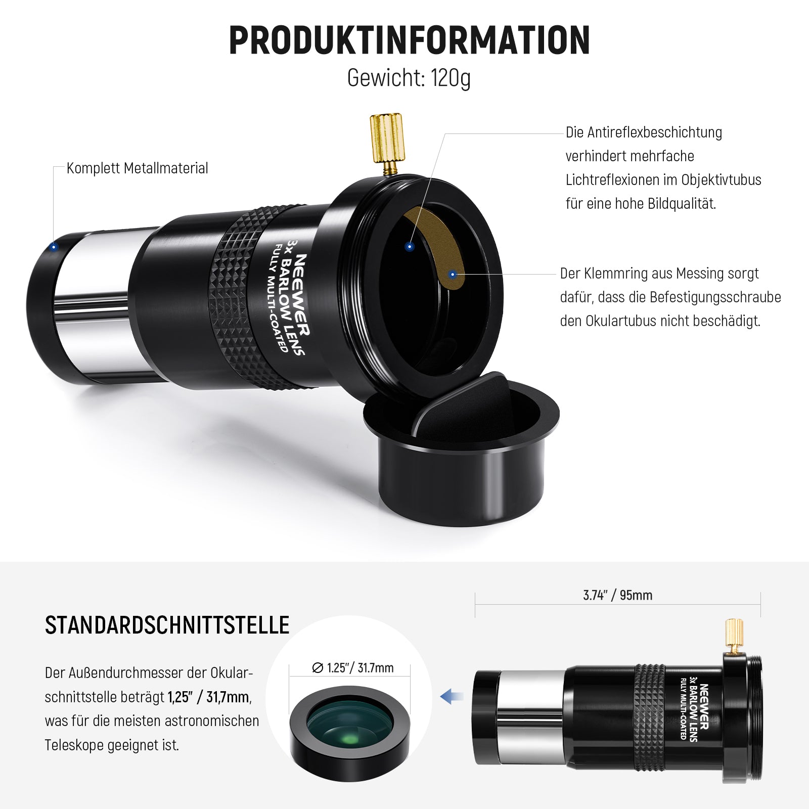 - 【Breite Okularkompatibilität】 Das 1,25" Barlowobjektiv kann mit den meisten Teleskopokularen mit einem Durchmesser von 1,25" verwendet werden. Kompatibel mit den meisten Teleskopmarken