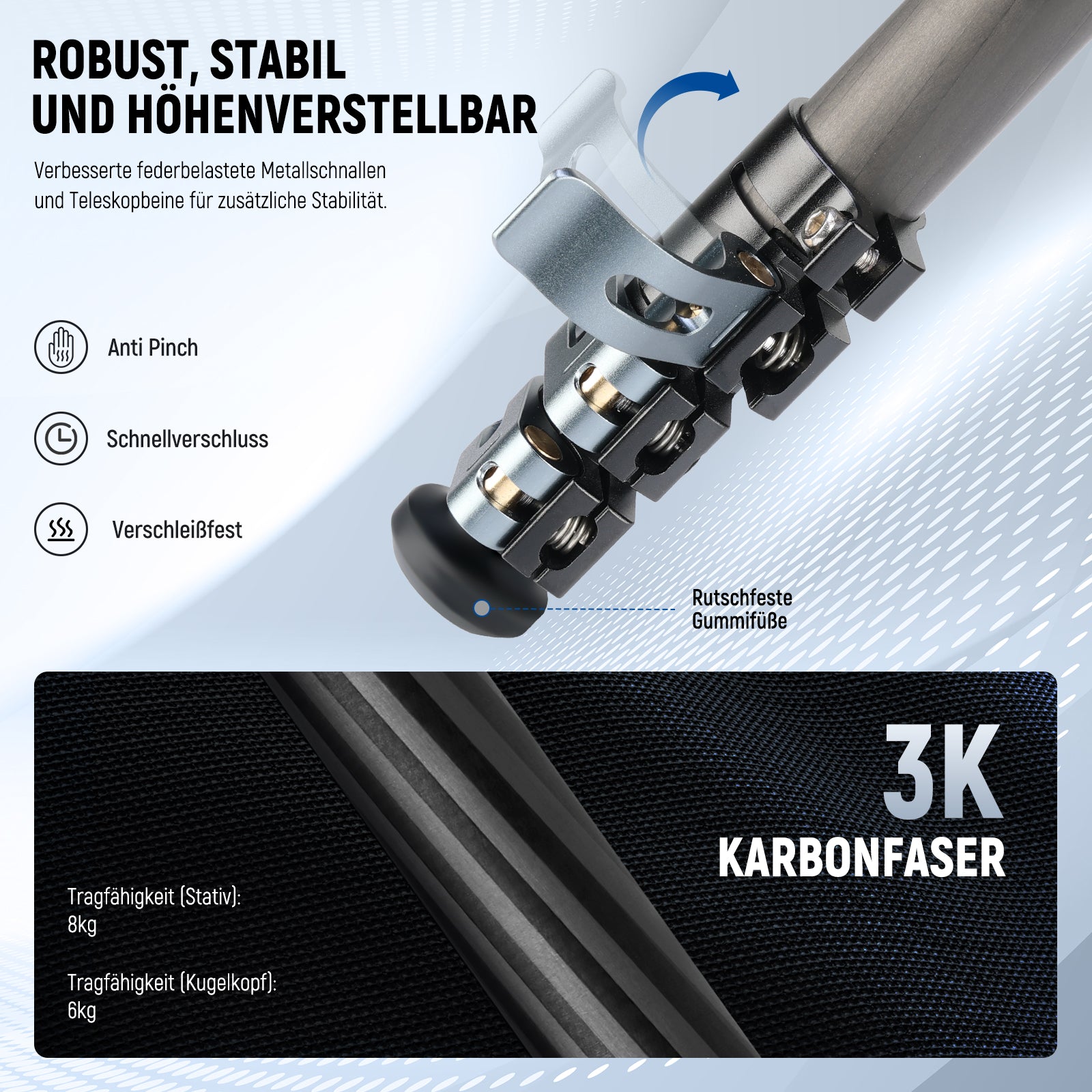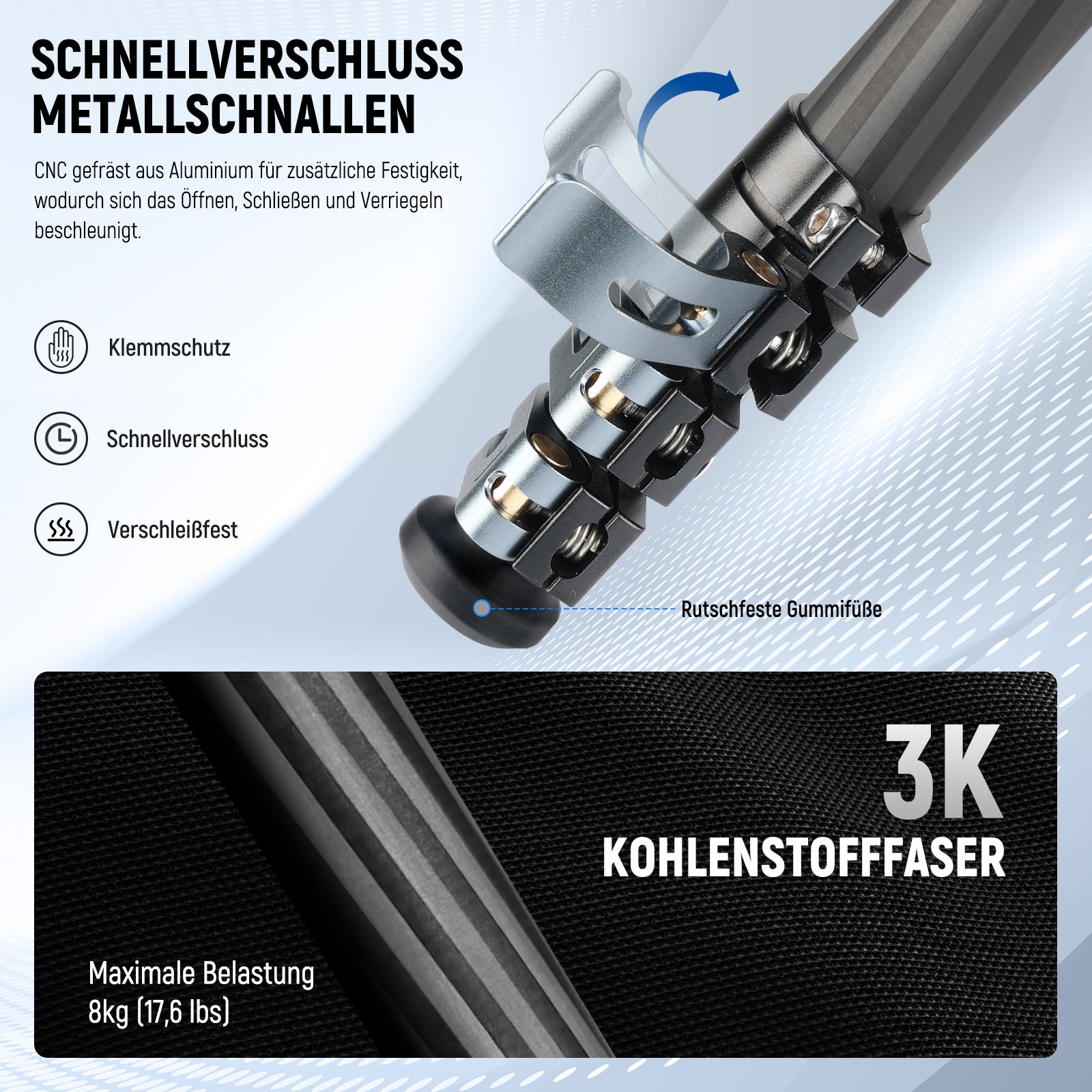 - Tragfähigkeit (Stativ): 17,6 lbs (8 kg)