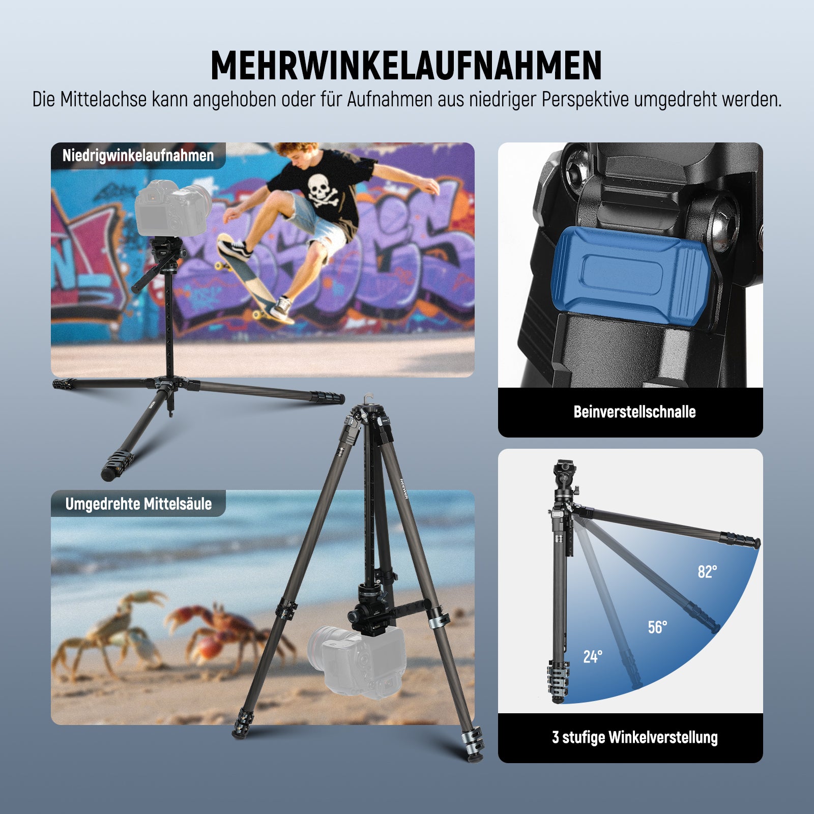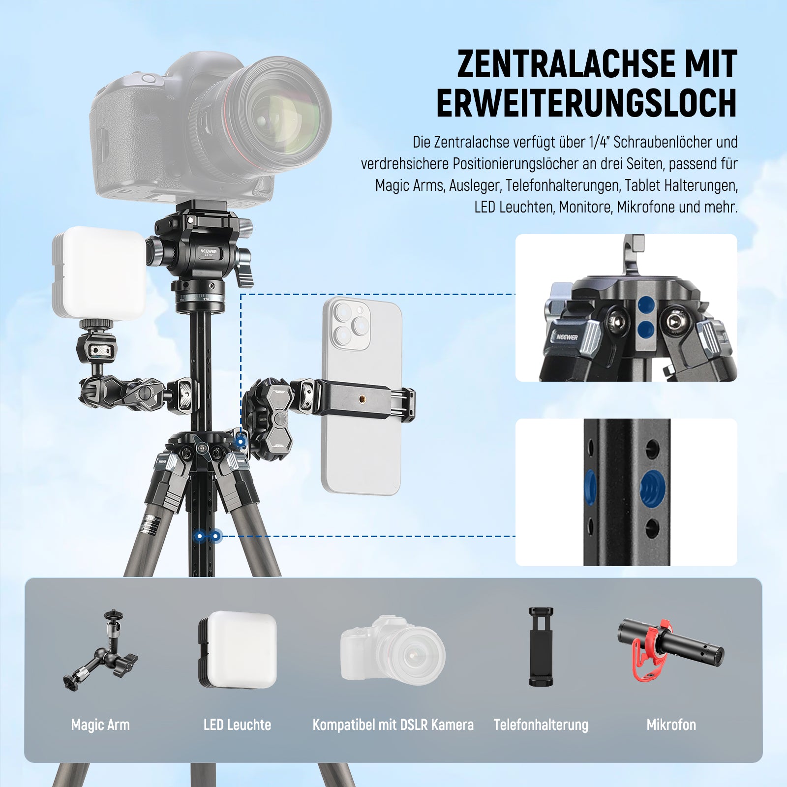 - Zentrale Achse mit Erweiterungslöchern- Das Stativ verfügt über eine vielseitige Mittelsäule, mit der die Höhe erhöht und für Aufnahmen aus niedrigen Winkeln auch umgedreht werden kann. Es verfügt über mehrere 1/4 Zoll Schraubenlöcher und verdrehsichere Positionierungslöcher an drei Seiten, sodass Zubehör wie Magic Arms, Boom Arms, Smartphone Halterungen, Tablet Halterungen, LED Leuchten, Feldmonitore, Mikrofone usw. für vielfältige fotografische Anforderungen angebracht werden können