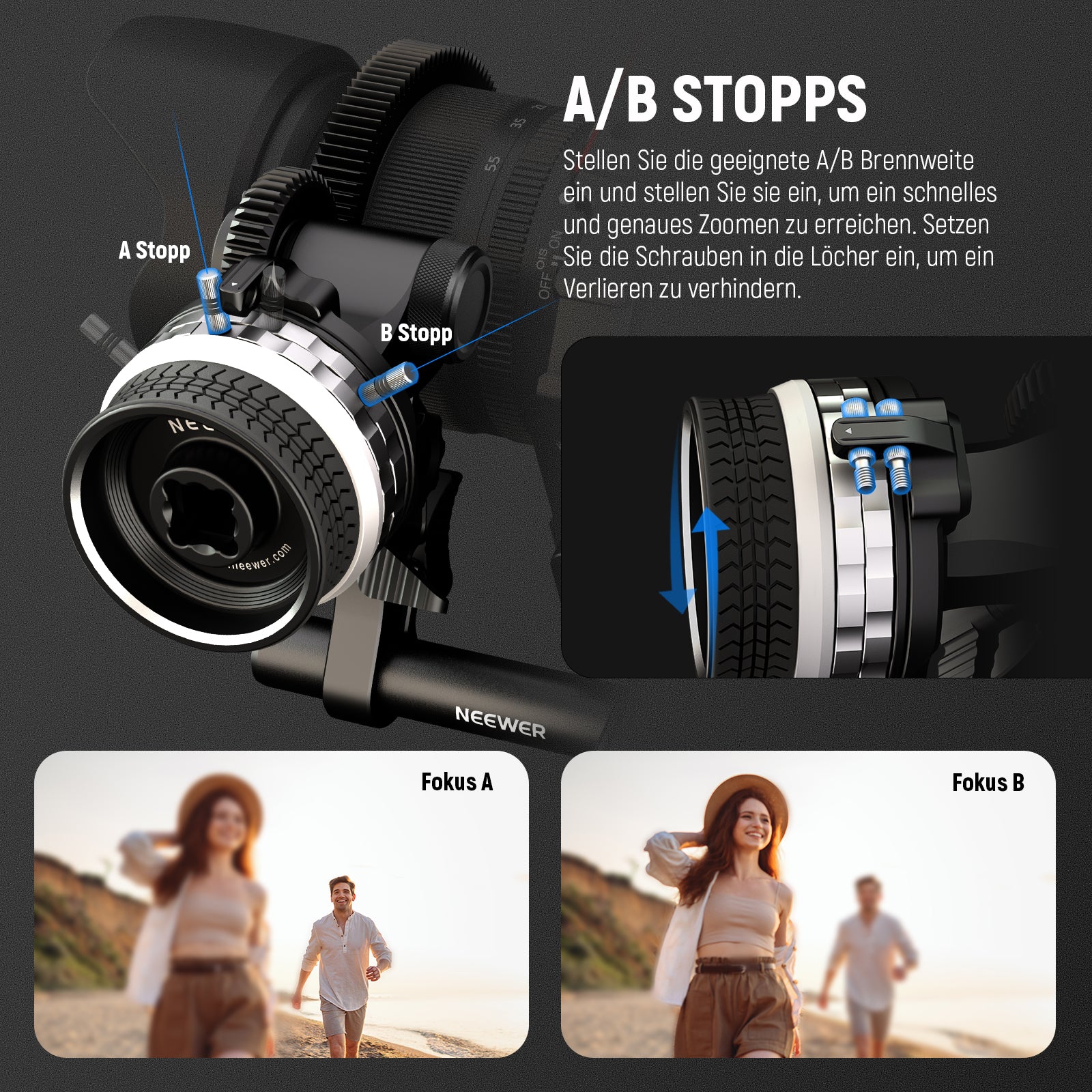 - 【Einstellbare A/B Anschläge】 Das Fokusrad verfügt über einstellbare A/B Anschläge, Sie können die entsprechende A/B-Brennweite voreinstellen und anpassen, um schnelles und genaues Zoomen entsprechend Ihren Aufnahmeanforderungen zu erreichen. Durch Lösen der A/B-Anschläge können Sie leicht eine stufenlose 360°Fokuseinstellung erreichen und sie in die Stopperlöcher einfügen, um zu verhindern, dass sie fehlen