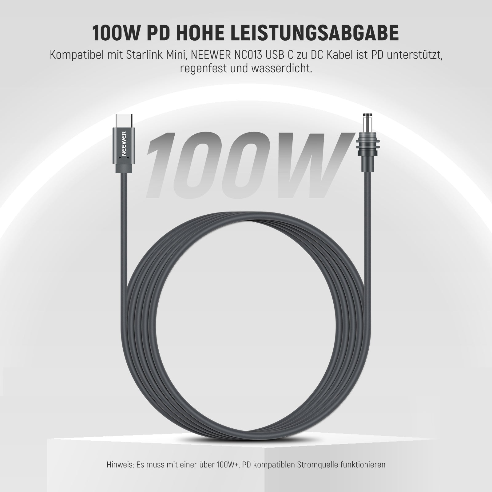 - 100 W PD High Power Delivery- Kompatibel mit Starlink Mini, NEEWER NC013 USB-C-auf-DC-Kabel ist PD-unterstützt, regenfest und wasserdicht. Es liefert bis zu 100 W Ausgangsleistung und funktioniert mit einem tragbaren 100-W-PD-Ladegerät, um Ihr Gerät online zu halten. Hinweis Es muss mit einer 100W+, PD kompatiblen Stromquelle funktionieren