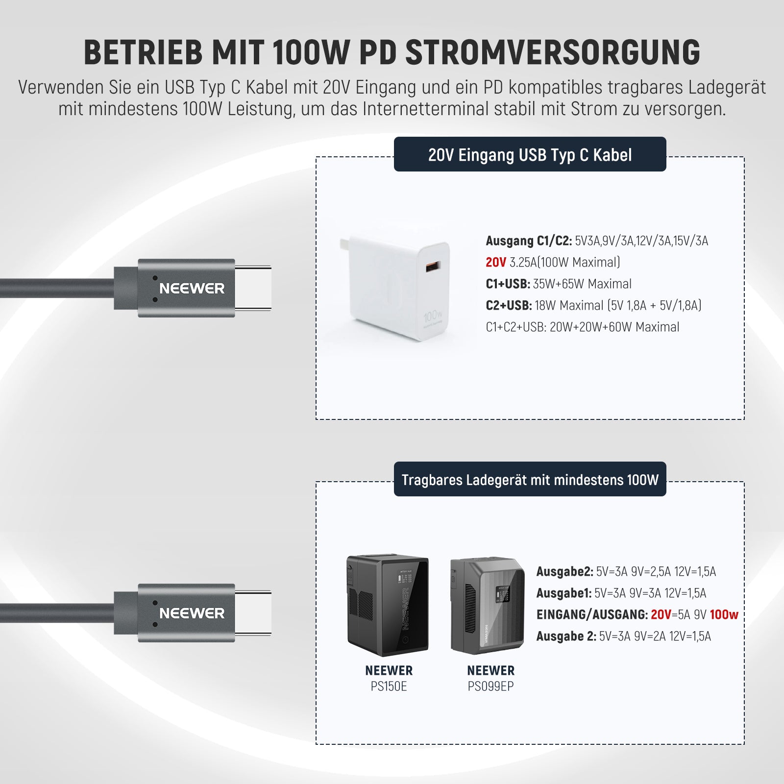 - Läuft mit 100 W PD-Stromquellen- Versorgen Sie Ihr Internet-Terminal mit stabilem Strom mit dem 20-V-Eingangs-USB-Typ-C-Kabel und einem PD-kompatiblen tragbaren Ladegerät von mindestens 100 W (wie NEEWER PS099EP und PS150E V-Mount-Batterien). Keine komplizierten Einstellungen erforderlich, was es zu einer idealen Plug-and-Play-Lösung für die Stromversorgung Ihres Geräts während Reisen oder Abenteuern macht