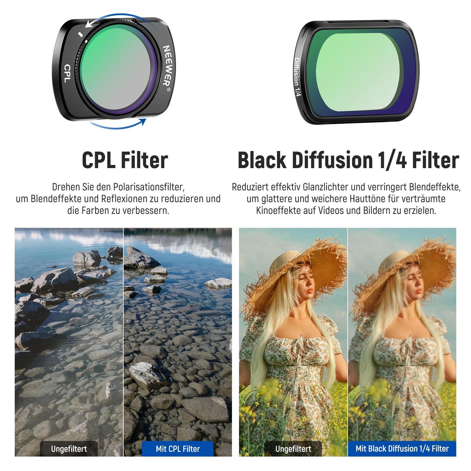 - Filter Typen: ND, CPL, Black Diffusion Filter