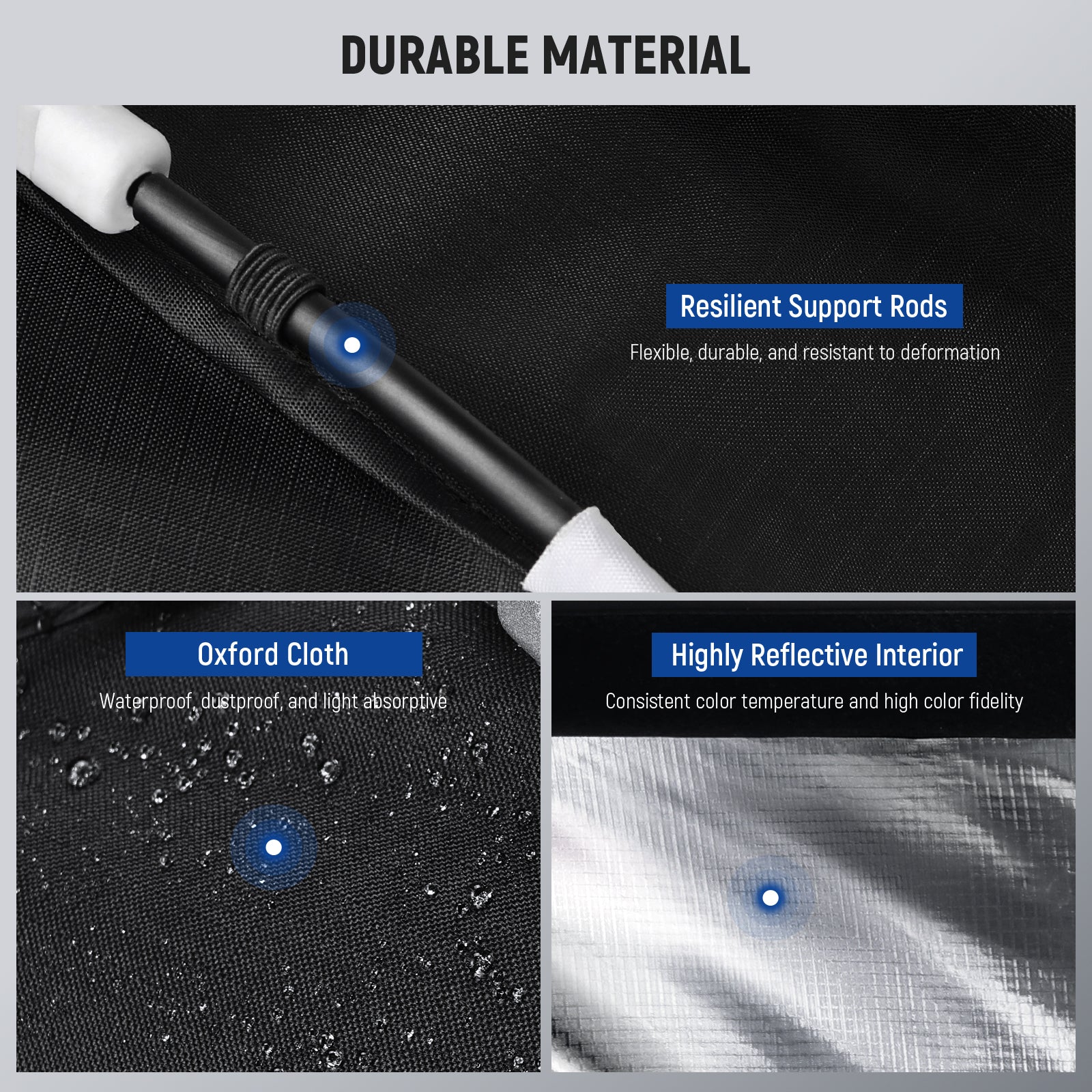 - 【Tragbare quadratische kleine Softbox】 Diese relativ kleine Softbox mit den Maßen 15,7 x 15,7 Zoll/40 x 40 cm verfügt über eine glänzende silberne Auskleidung, die die Ausgabe verbreitert und streut und gleichzeitig den neutralen Farbwiedergabeindex (CRI) und die Farbtemperatur beibehält. Die gleichmäßige Lichtverteilung kann Hautunreinheiten und Schatten minimieren, Ihre Haut glätten und Gesichtsstrukturen definieren