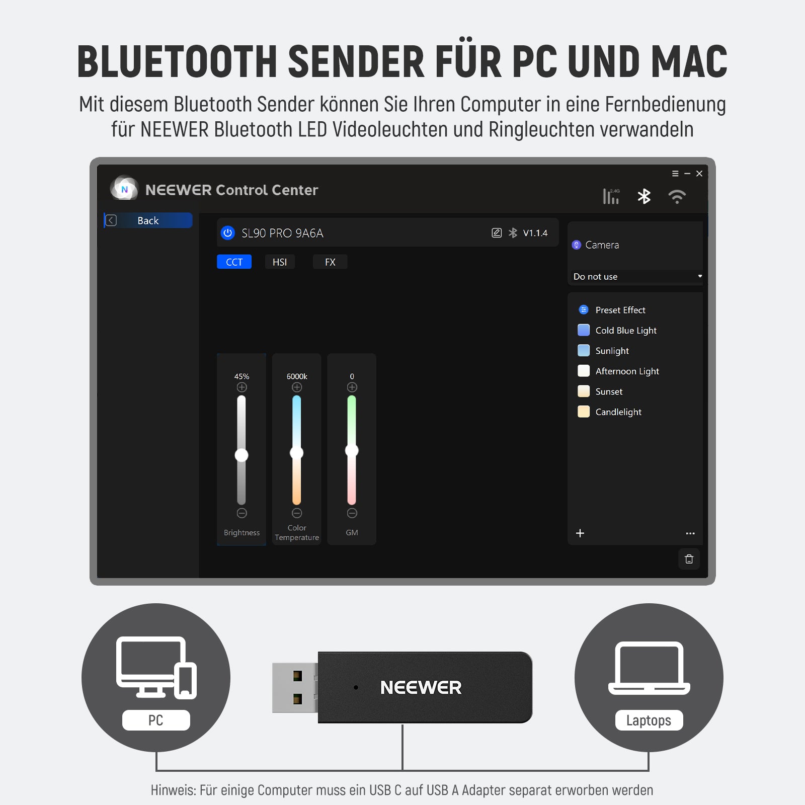 • Bluetooth-Transmitter für PC und Mac- Dieser Bluetooth-Sender kann Ihren Computer in eine Fernbedienung für NEEWER Bluetooth-LED-Videoleuchten und Ringlichter verwandeln (außer RGB1 und RGB2), ideal für Gamer, Online-Tutoren und Zoom-Meeting-Teilnehmer, die sich auf ihre Monitore konzentrieren müssen