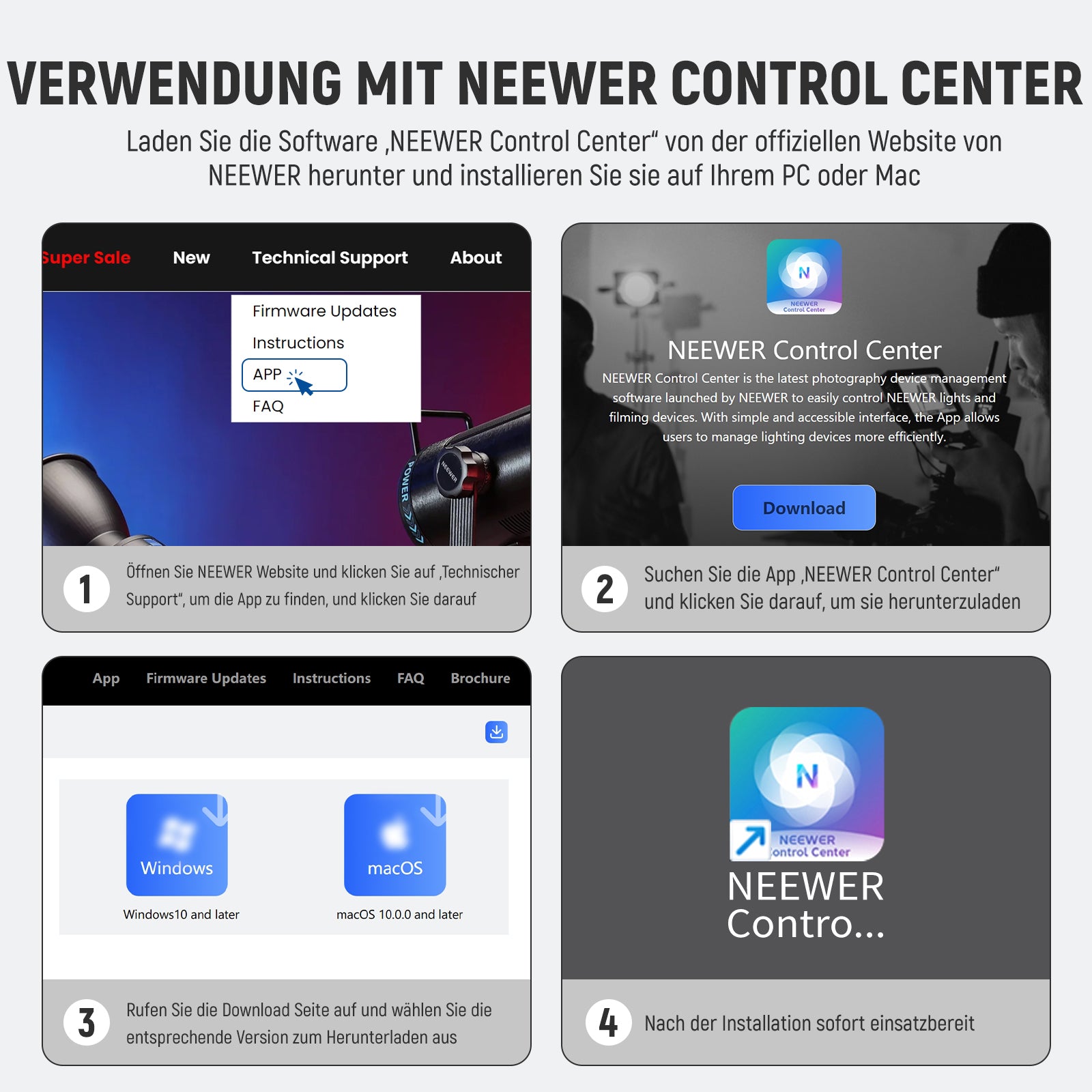 • Verwendung mit NEEWER Control Center- Laden Sie die Software „NEEWER Control Center“ von der offiziellen NEEWER Website herunter und installieren Sie sie auf Ihrem PC oder Mac. Anschließend können Sie die Beleuchtung Ihres Computers mit wenigen Mausklicks steuern. Auch kompatibel mit Elgato Stream Deck