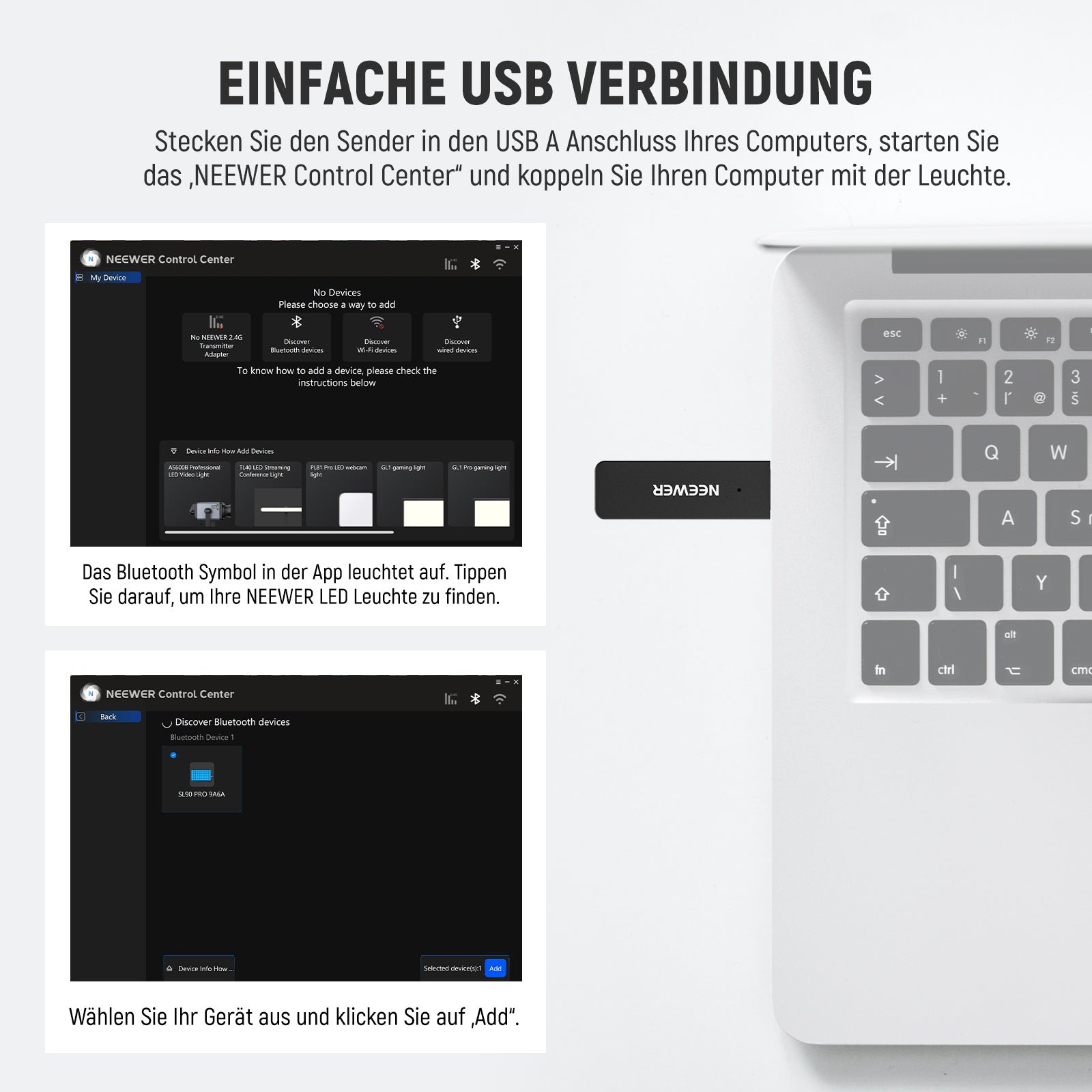 • Einfache USB-Verbindung- Stecken Sie den Sender in den USB-A-Anschluss Ihres Computers, führen Sie das "NEEWER Control Center" aus und koppeln Sie Ihren Computer mit dem Licht. Für einige Computer muss ein USB-C-auf-USB-A-Adapter separat erworben werden