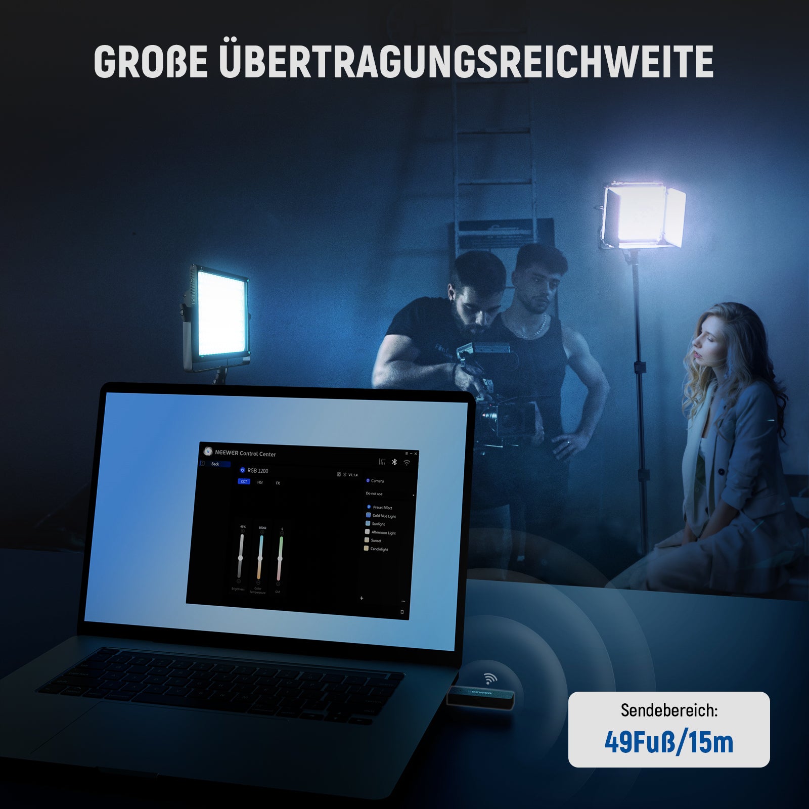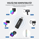 • Operating System Compatibility- Der Bluetooth-Sender ist kompatibel mit Windows 7, Windows 10, macOS 10.14 und höher.  Derzeit kompatible Leuchten sind GL25C, HS60B, SL90, SL90 Pro, RGB1200, RGB C80, CB60B, CB60 RGB, CB200B, TL40, TL60, GR18C, AS600B, RL45B und RP19H. Weitere kompatible Leuchten werden in Kürze verfügbar sein