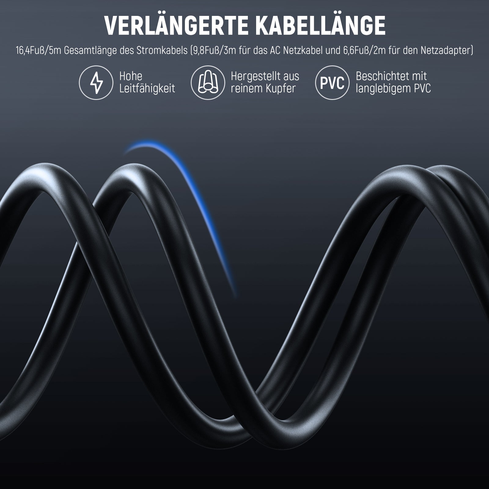 - Verlängerte Stromkabel- Die Kabel bestehen aus reinem Kupfer für eine hohe elektrische Leitfähigkeit und sind mit PVC beschichtet, um häufigem Biegen und Aufrollen standzuhalten. Mit einer Länge von 16,4Fuß/5m (9,8Fuß/3m Länge für das AC Netzkabel und 6,6Fuß/2m für das Ausgangskabel des Netzteils) ermöglichen Ihnen die Kabel, Ihren Blitz ungehindert zu bewegen und zu positionieren