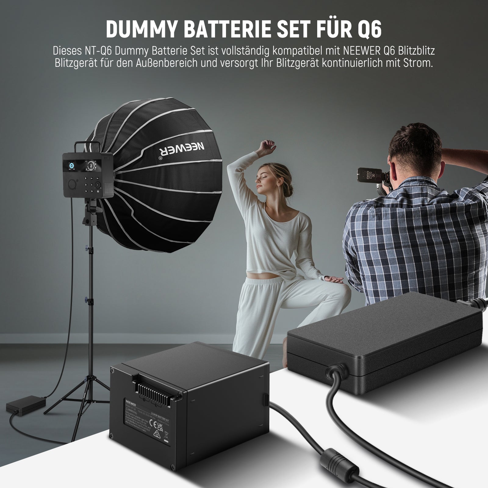 - Dummy Batterie Set für Q6- Dieses NT-Q6 Dummy Batterie Kit ist exklusiv mit NEEWER Q6 Outdoor Blitzlicht kompatibel und versorgt Ihr Blitzgerät kontinuierlich mit Strom, vermeiden Sie den häufigen Batteriewechsel der NB-Q6 Lithium Batterie (die Standardbatterie für den Q6 Blitzgerät) über das mitgelieferte AC Netzteil und Kabel, perfekt für Studio und Innenaufnahmen, Vlogging, Live Streaming und Filmproduktion