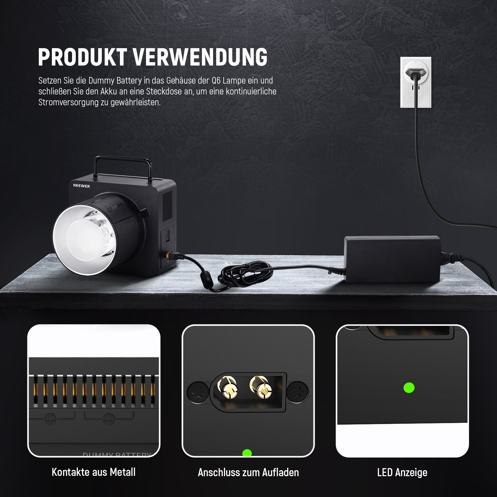 - Verwendung des Produkts- Setzen Sie den Dummy Akku in den Lampenkörper der Q6 ein, schließen Sie ihn mithilfe des mitgelieferten Netzkabels und dem Adapters (EU Stecker) an eine Steckdose an, und dann sind Sie bereit zu gehen