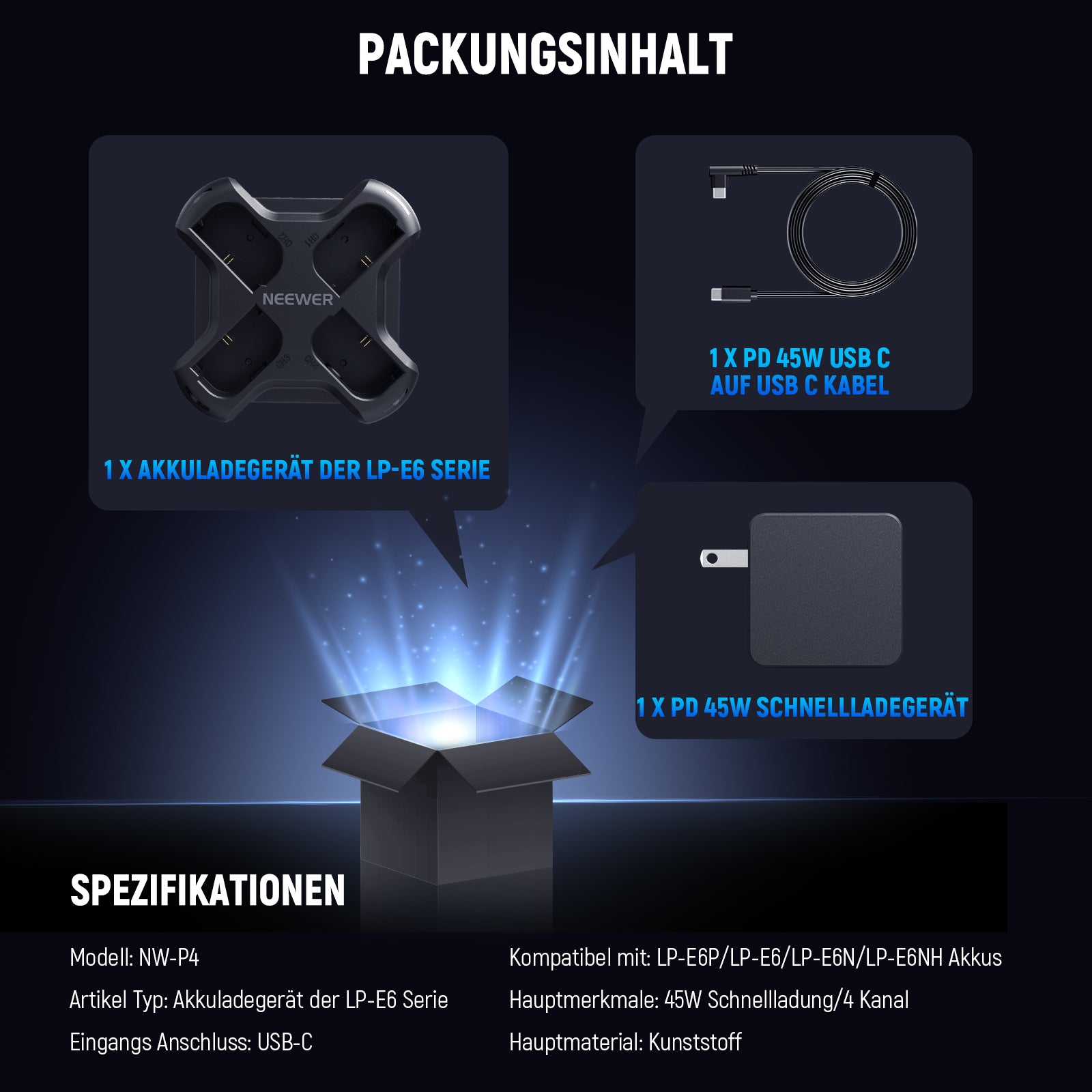 NEEWER NW-P4 45W PD 4 Kanal USB Kamera Akku Ladegerät für LP-E6 Serie