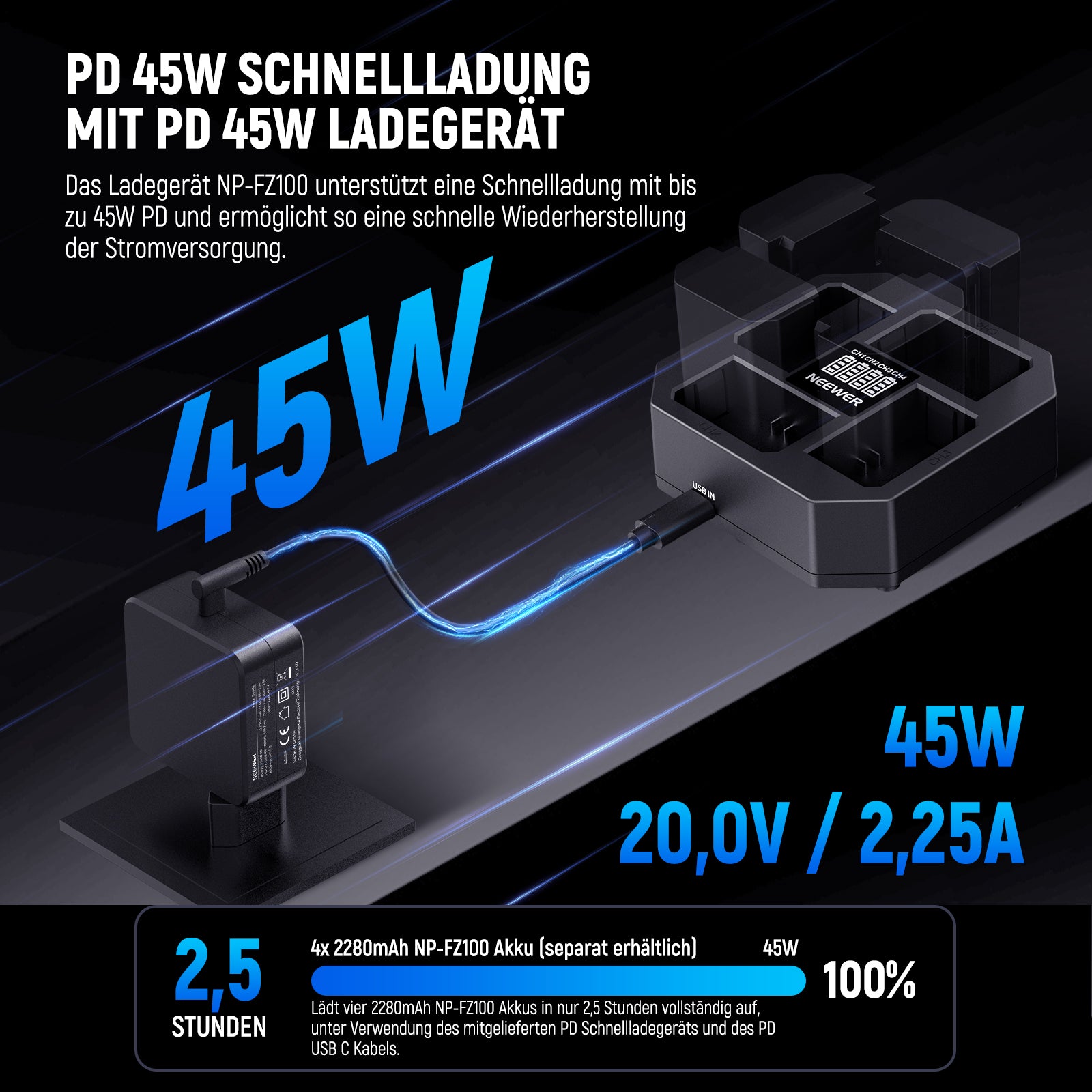 - PD 45W Schnellladen mit PD 45W Ladegerät- Ladegerät NP-FZ100 unterstützt bis zu PD 45W Schnellladung und sorgt für schnelle Wiederherstellung der Stromversorgung. Mit mitgelieferten PD 45W Schnellladegerät können vier 2280mAh NP-FZ100 Akkus in 2,5 Std. vollständig aufgeladen werden, wodurch Ausfallzeiten minimiert werden. Effiziente Stromversorgungslösung als Kamerazubehör zum Laden des NP-FZ100 Li-Ion Akkus, Kompatibel mit Sony Alpha 7 iv (A7 IV) A9 III A1 A7 RV A7C II Alpha 6700 ZV-E1 FX3 FX30