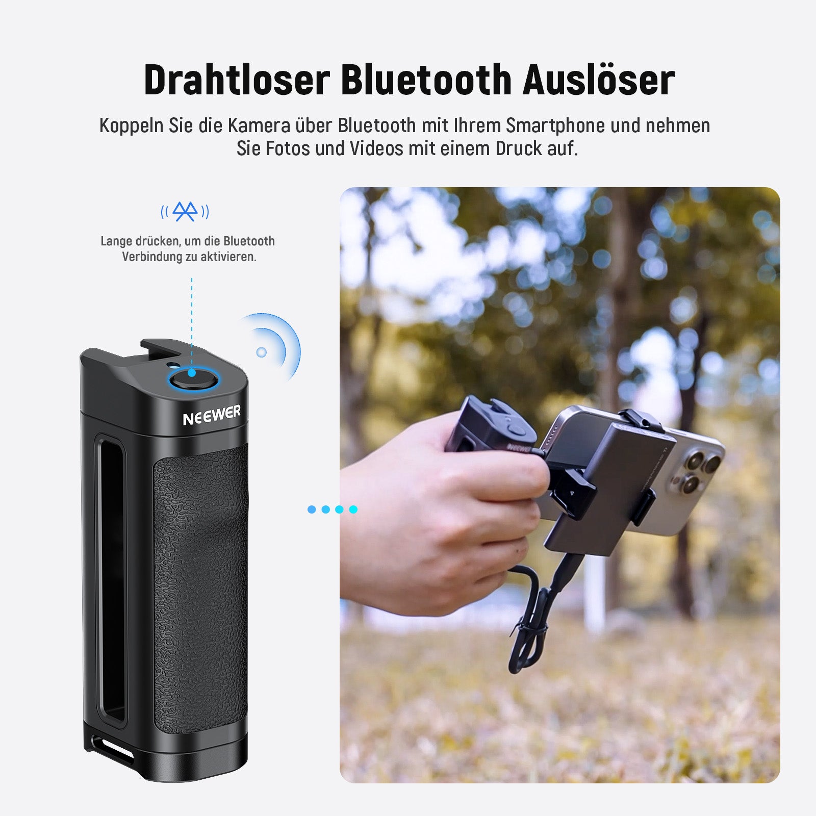 Seitengriff mit Bluetooth Auslöser- Dieser Seitengriff mit Bluetooth Modell kann über Bluetooth eine Verbindung zu Ihrem iOS/Android Telefon herstellen und ermöglicht das Aufnehmen von Fotos und Videos durch Drücken des Auslösers. Perfekt für Filmdreh, YouTube/TikTok Vlogging, Live Streaming, Selfies und andere Kreationen