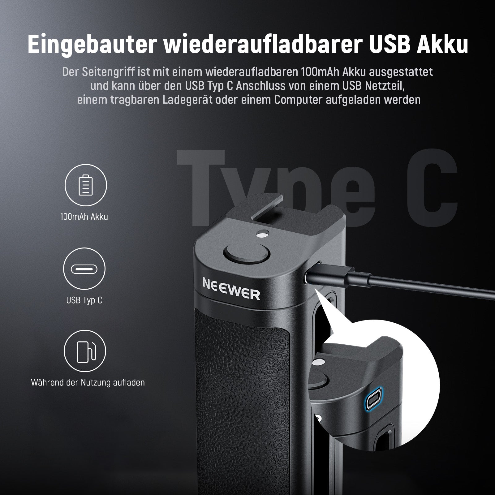 Eingebauter USB Akku- Der Funk Bluetooth Auslöser Seitengriff ist mit einem 100mAh Akku ausgestattet und kann über den USB Typ C Anschluss von einem USB Netzteil, einem tragbaren Ladegerät oder einem Computer aufgeladen werden