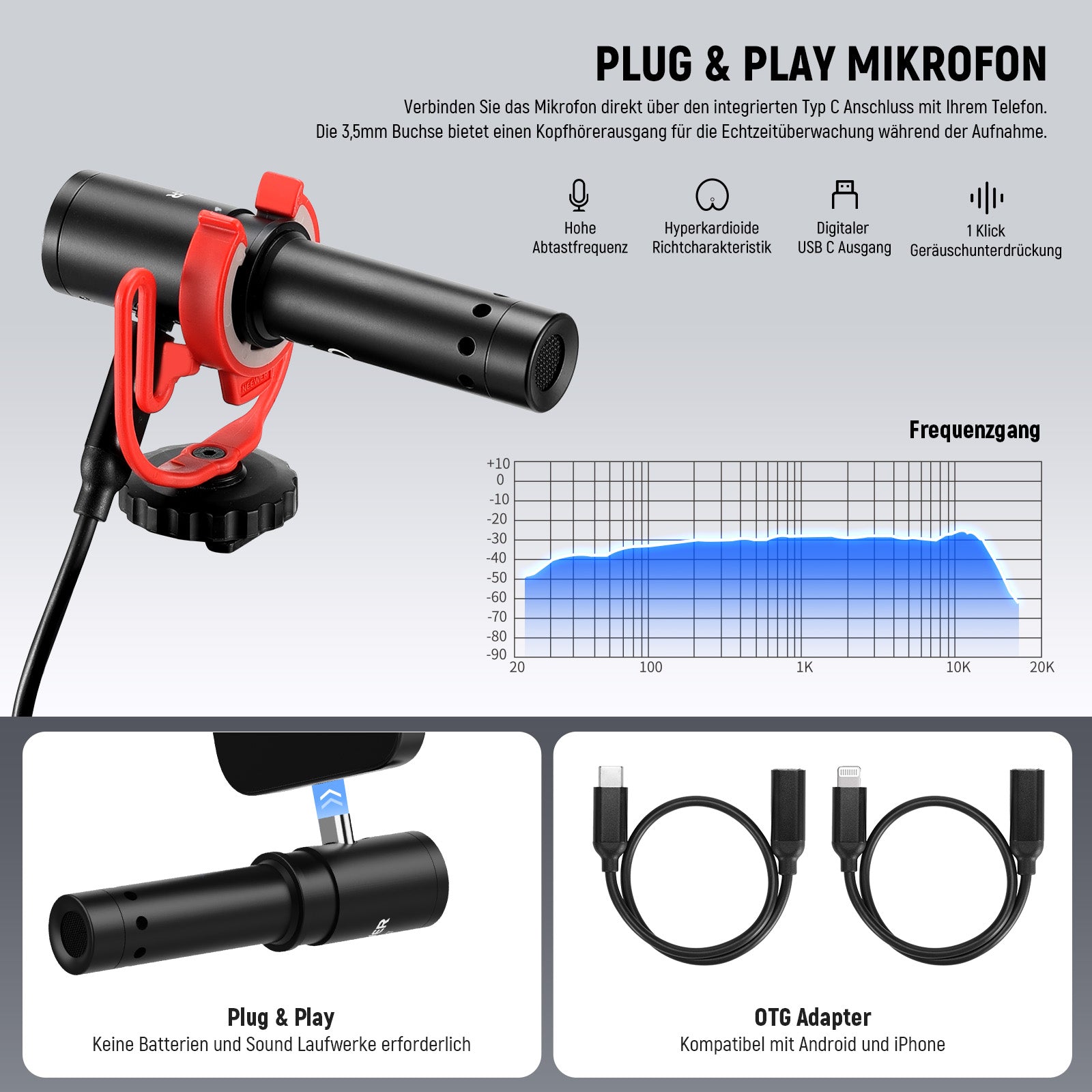 - Plug & Play USB C Mikrofon- Das Mini Nierenmikrofon mit Geräuschunterdrückung sorgt für klaren Klang. Sein USB C Anschluss, gepaart mit zwei mitgelieferten OTG Adaptern, ist kompatibel mit Samsung S24 Ultra, anderen Android Smartphones sowie iPhone 16 Pro Max und früheren iPhone Modellen. Plug & Play, einfach einstecken und mit der Aufnahme beginnen