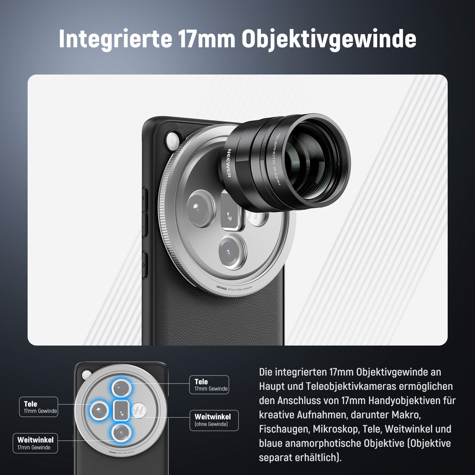 - Integrierte 17mm Objektivgewinde- Die integrierten 17mm Objektivgewinde an der Haupt und Tele Kamera ermöglichen den Anschluss von 17mm Smartphone Objektiven für kreative Aufnahmen, darunter Makro, Fischaugen, Mikroskop, Tele, Weitwinkel und blaue anamorphotische Objektive (Objektive separat erhältlich)