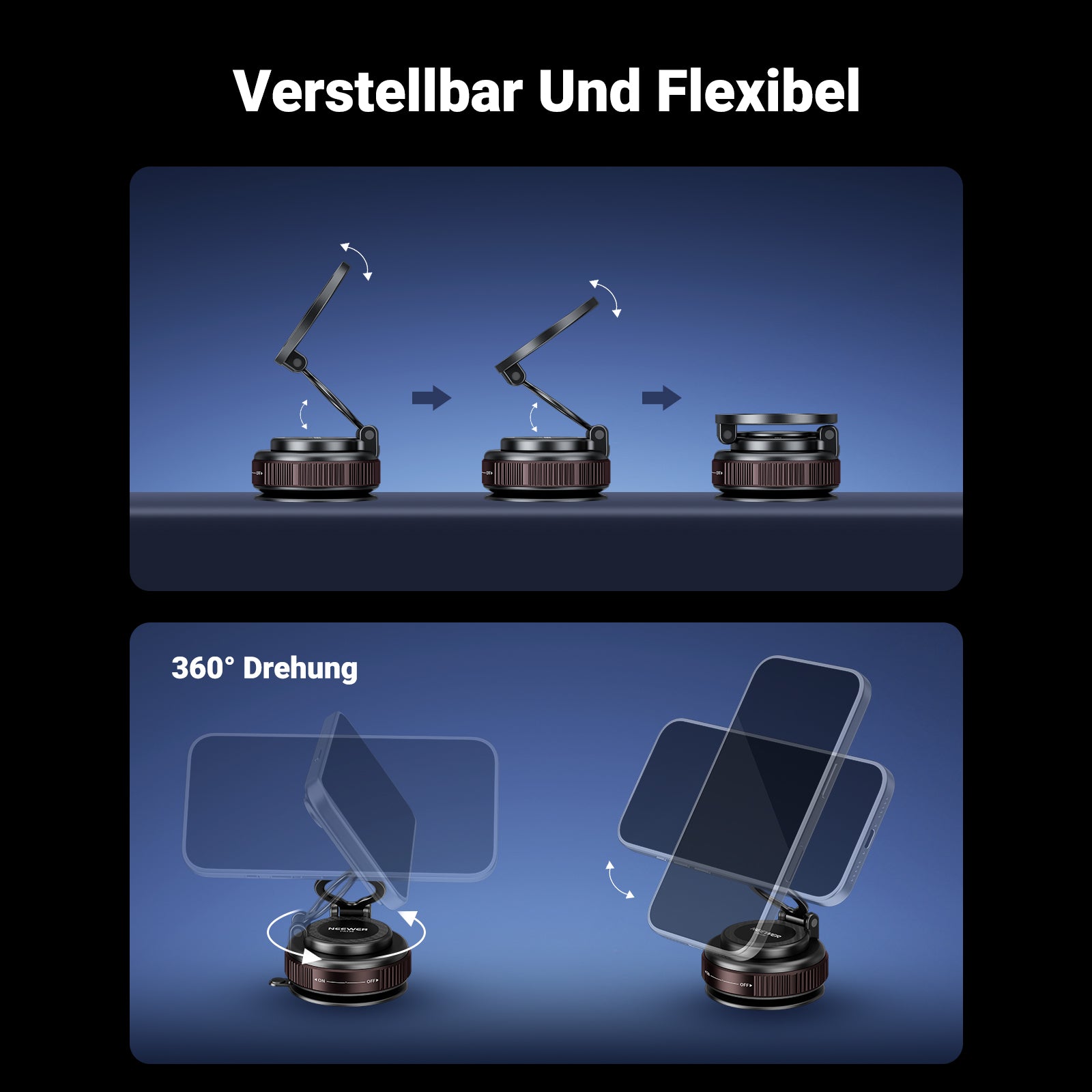 - 【Vacuum Suction und manuelle Drehung】 Einfach drehen, um die Saugnapf Handy Halterung sicher am Armaturenbrett, an der Windschutzscheibe, am Schreibtisch oder an Fitnessgeräten zu befestigen, damit Sie Ihr Smartphone leicht erreichen können, und es mit einem seitlichen Griff schnell wieder abnehmen