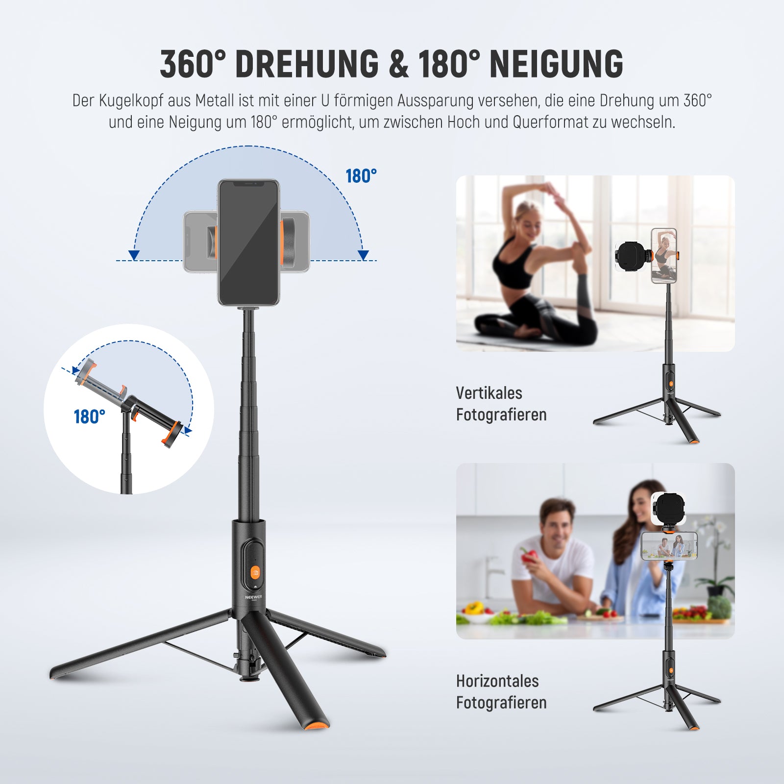 - Höhen und Winkelverstellung- Mit einem einstellbaren Höhenbereich von 31 bis 147 cm bietet das Stativ vielseitige Einsatzmöglichkeiten. Der Handyhalter ermöglicht eine Neigung von 180° nach vorne und hinten – für mühelose Wechsel zwischen Hoch- und Querformat. Das Design sorgt dabei für eine stabile Ausrichtung und schützt Ihr Gerät bei jeder Anpassung.