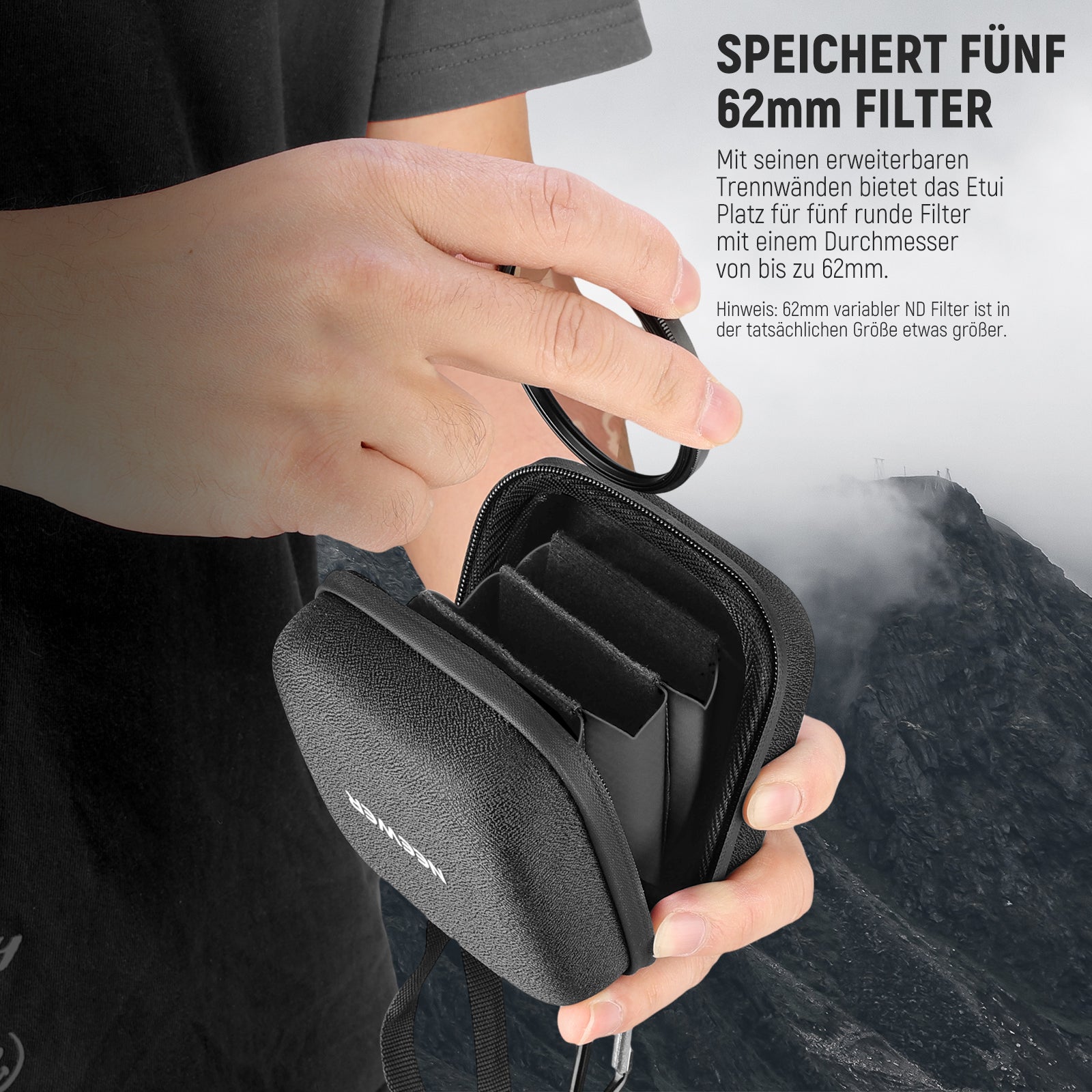 - Hält drei 62mm Filter- Mit erweiterbaren Trennwänden bietet die Filtertasche Platz für drei runde Filter mit einem Durchmesser von bis zu 62mm. Hinweis: Variable 62mm ND Filter sind in der tatsächlichen Größe etwas größer