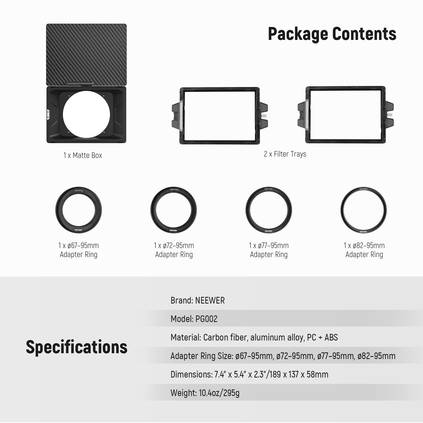 - 【Vielseitige modulare Matte Box】 Die NEEWER PG002 Matte Box ist perfekt für kompakte spiegellose Kameras und DSLR Kameras, kompatibel mit Sony A7R IV A7R V A7S III Canon R6 II R6 R5. Es kann Blendung und Blendenflecken vermeiden und die Belichtungskontrolle verbessern, indem übermäßiges Sonnenlicht und andere Lichtquellen blockiert werden