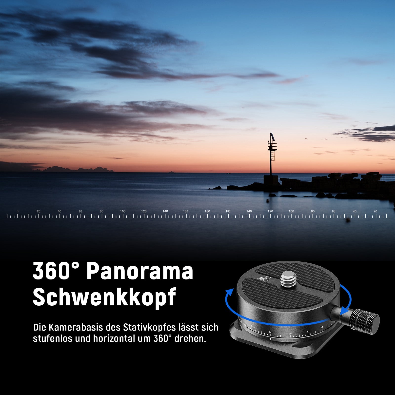 - 360° Panorama Schwenkkopf- Der Kamerasockel des Stativkopfs lässt sich um 360° horizontal drehen und eignet sich damit ideal für die mühelose Aufnahme atemberaubender Panoramaaufnahmen. Der Feststellknopf sorgt für zusätzliche Stabilität bei der Benutzung
