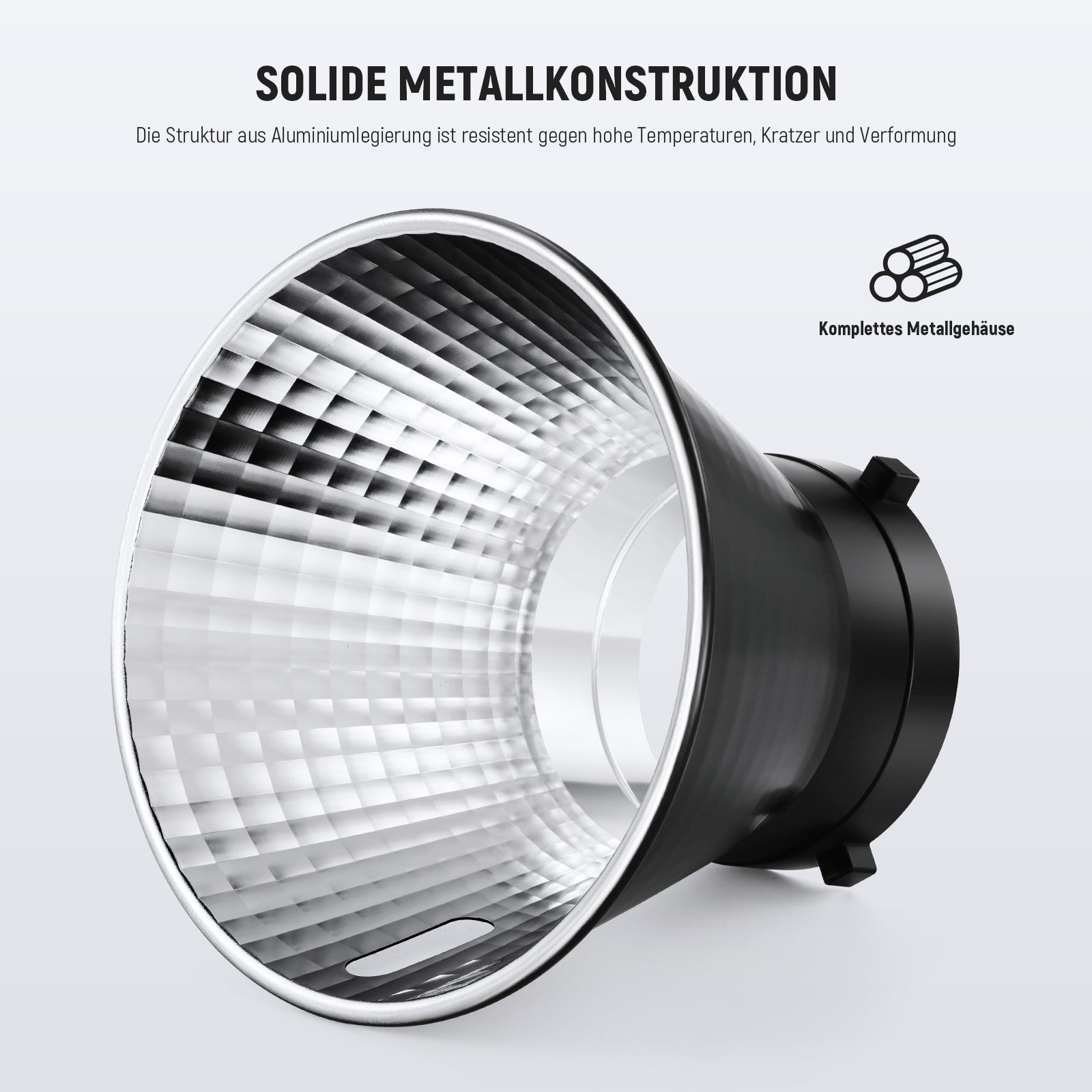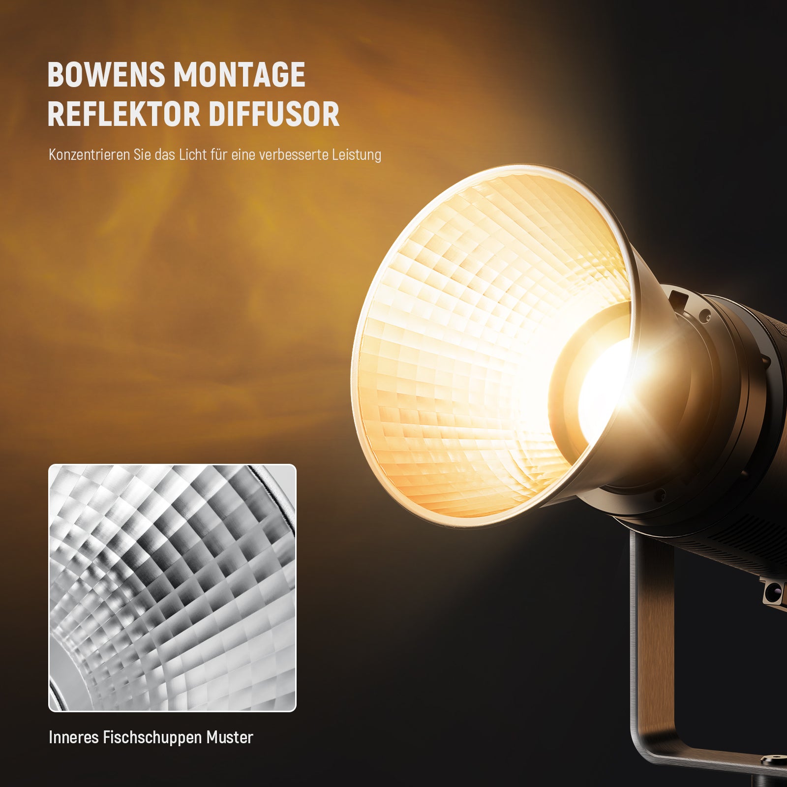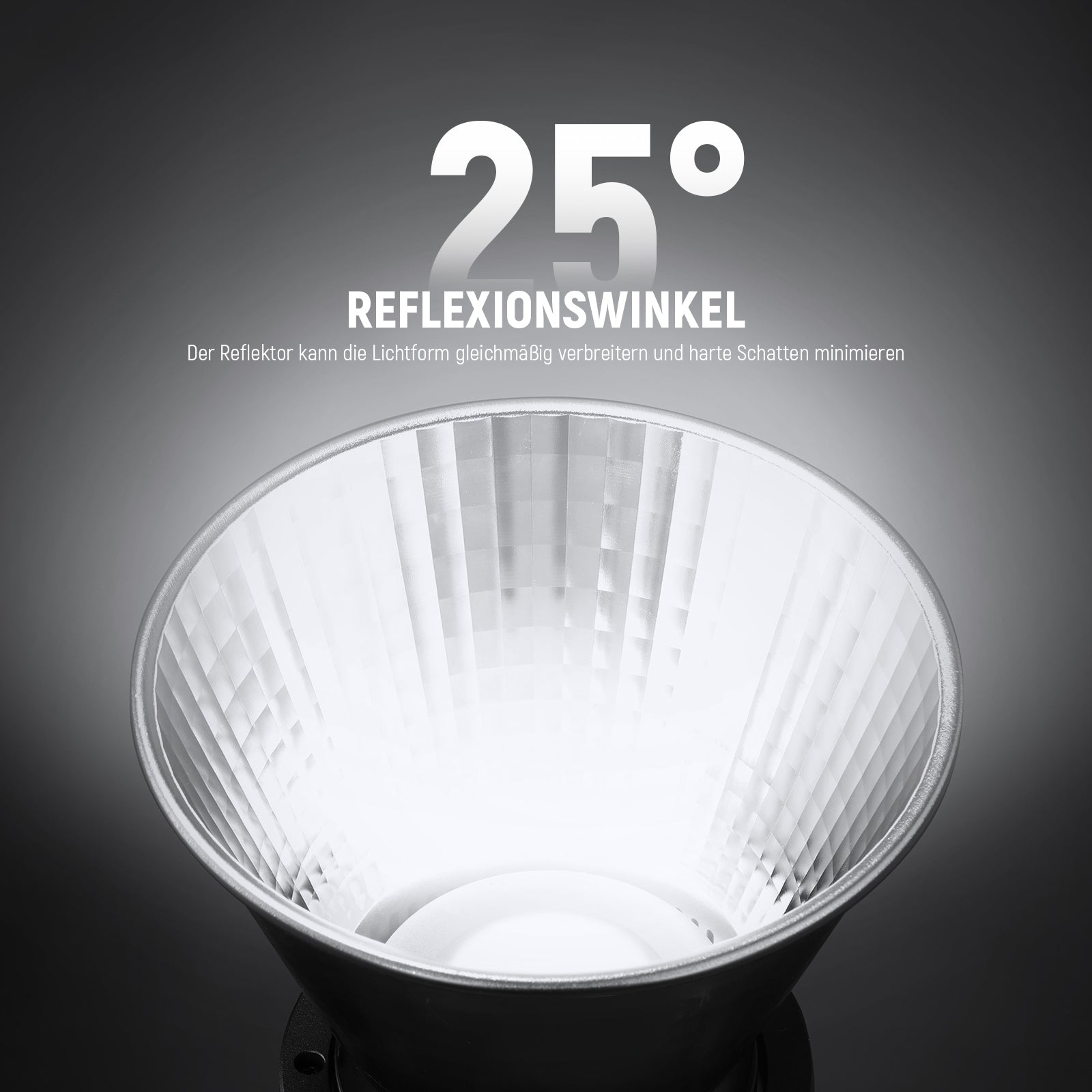 • 【Inneres Fischschuppenmuster】 Mit einem Fischschuppenmuster kann dieser Standardreflektor mit einem Reflexionswinkel von 25° die Lichtform gleichmäßig verbreitern und harte Schatten minimieren