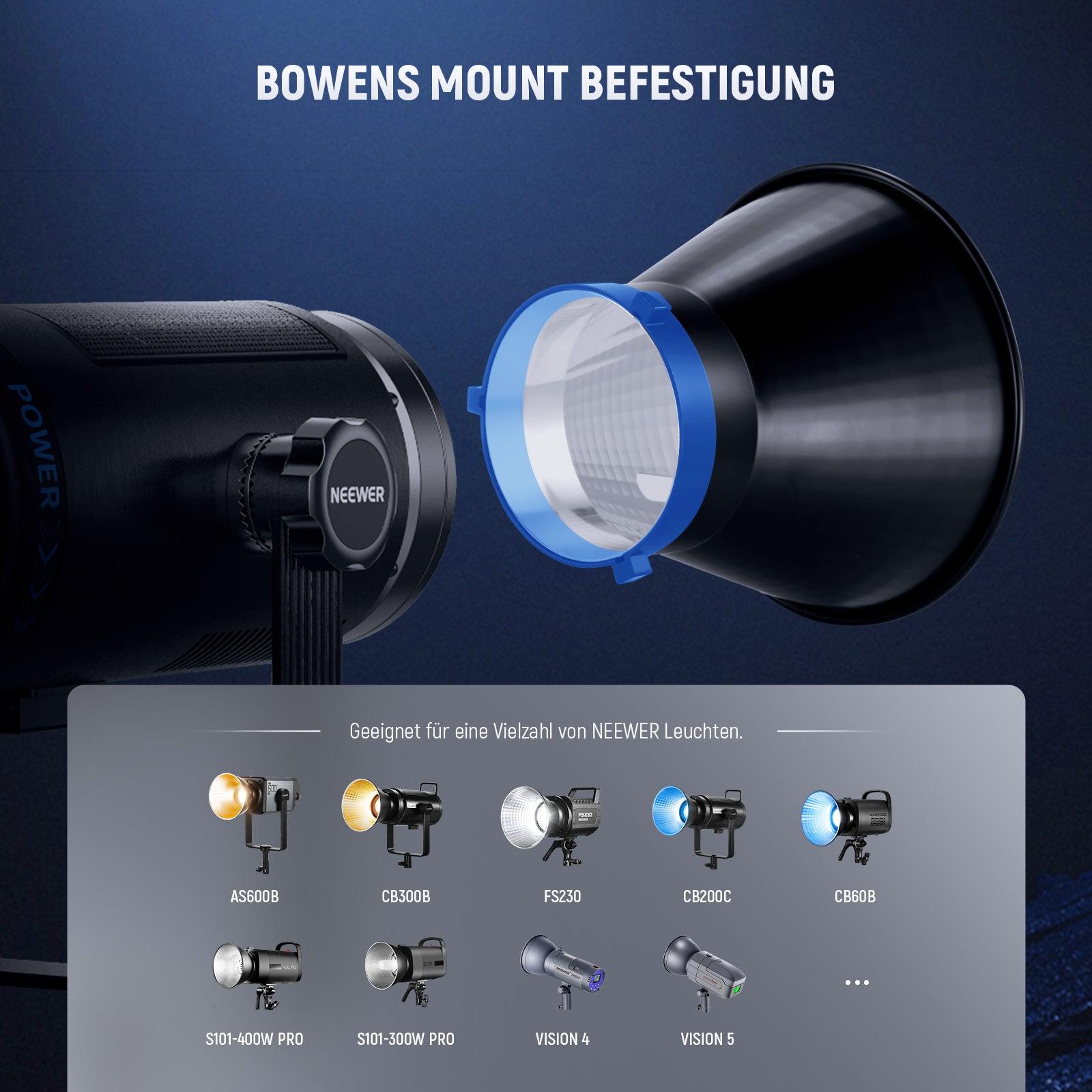 • 【Universelle Bowens Mount】 Geeignet für NEEWER CB60/CB60B/CB60RGB/CB100/CB100B/CB150/CB200B/CB300B/ FS150/FS150B/FS230/FS230B LED Videoleuchten und Q4/Vision 4/Vision 5/S101-400 Pro/S101-300W Pro Studio Monolight Blitze. Auch kompatibel mit Godox und kompatibel mit Aputure
