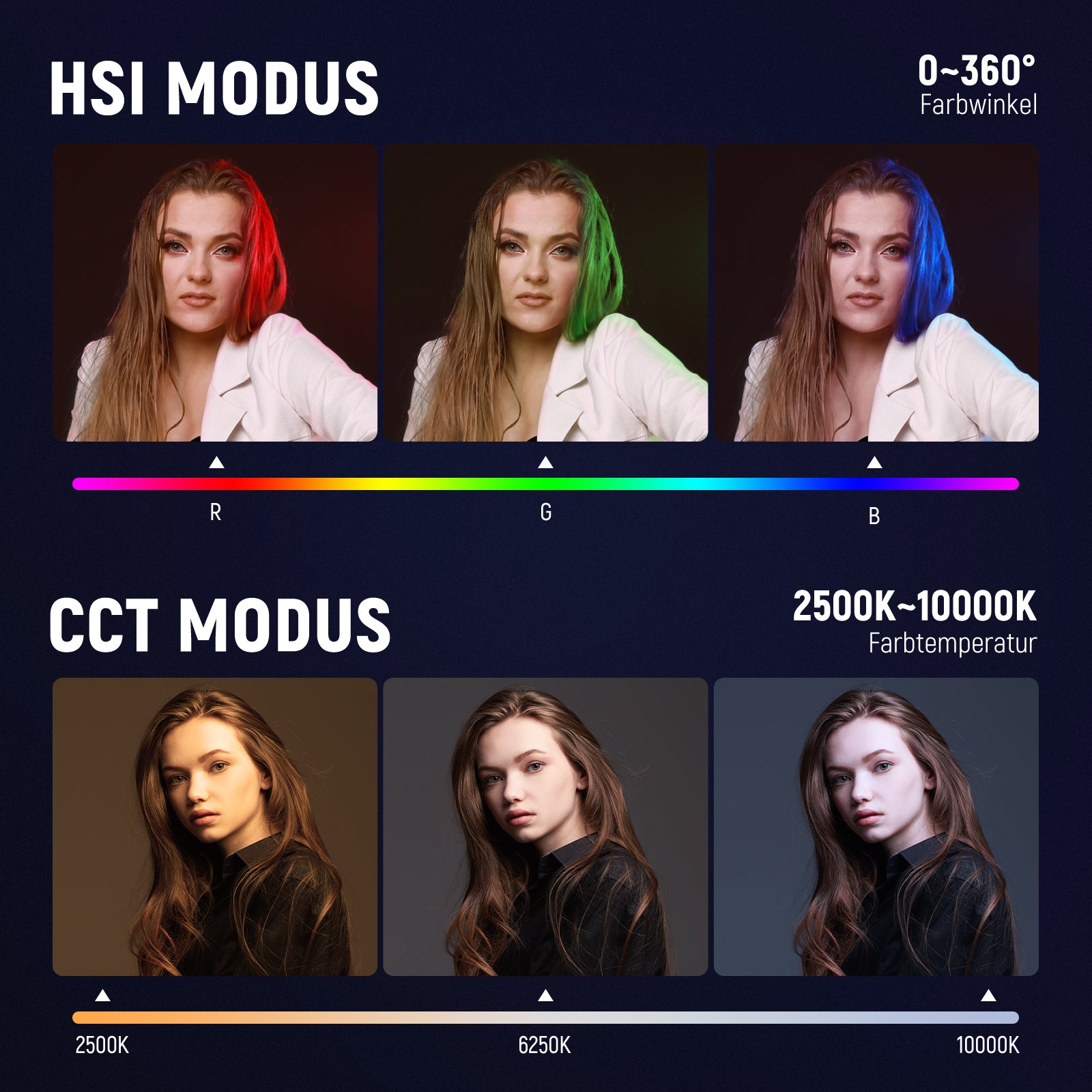 - 【Vielseitiges RGB Videoleuchte auf der Kamera】 Dieses verbesserte 10W RGB LED Licht erzeugt Effekte, die keine Grenzen kennen. Der CCT Modus bietet eine Farbtemperatur von 2500K-10000K von warmweiß bis kaltweiß und einen präzisen Dimmbereich von 0-100% mit 1% Schritten, maximale Beleuchtungsstärke von 1100lux/0,5m. Der HSI Modus bietet Ihnen das gesamte RGB Spektrum, indem er Farben auf Basis von 360° Farbtönen sowie 0-100% Sättigung und Intensität mischt