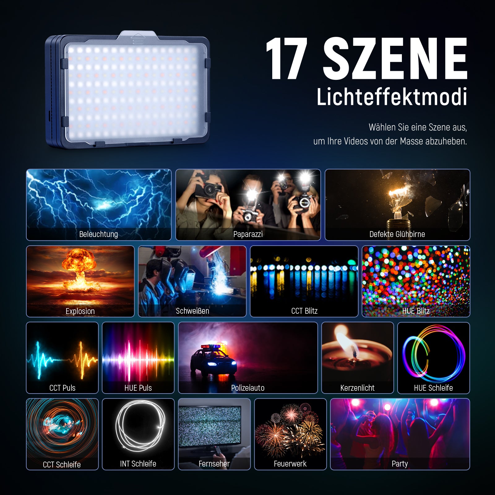 - 【17 Szeneneffekte für die Filmerstellung】 Im FX Modus können Sie mit 17 einzigartigen Szenen fesselnde Videos und Kurzfilme produzieren, die es mit professionellen Studios aufnehmen können. Die Szenen sind Blitz, Paparazzi, Defekte Glühbirne, Explosion, Schweißen, CCT Blitz, Hue Blitz, CCT Puls, Hue Puls, Polizeiauto, Kerzenlicht, Hue Schleife, CCT Schleife, INT Schleife, TV Bildschirm, Feuerwerk und Party