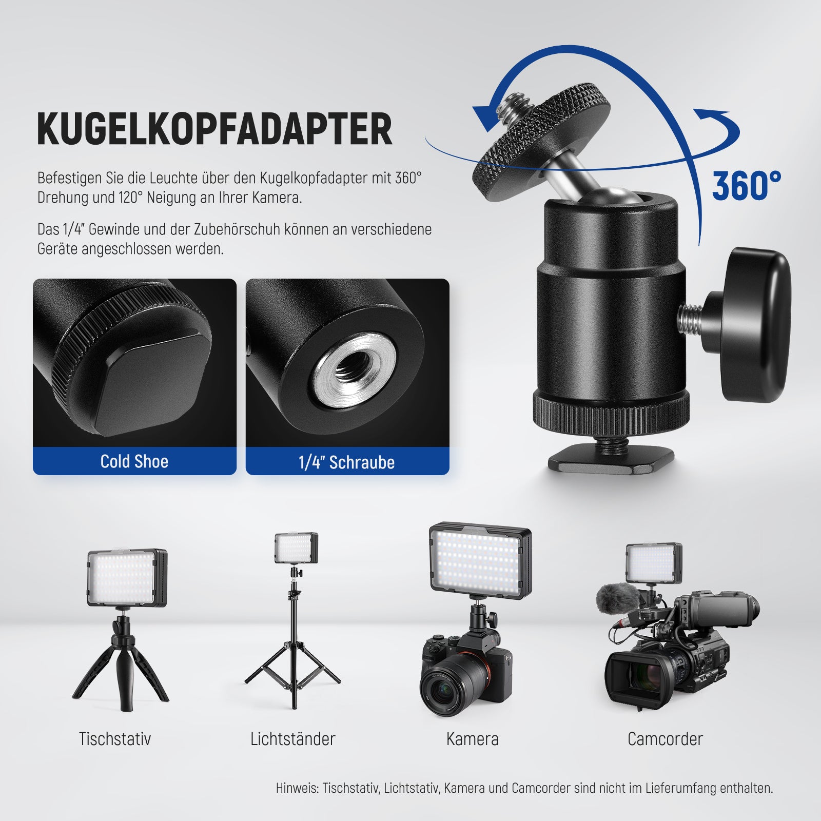 - 【360° Swivel Cold Shoe Ball Head】 Als kompakte und leichte Leuchte kann sie über den Kaltschuh Kugelkopfadapter an Ihrer DSLR Kamera befestigt und um 360° geschwenkt oder um 120° geneigt werden, um jeden Beleuchtungswinkel zu ermöglichen. Das 1/4" Gewindeloch kann das Licht auch an ein Lichtstativ oder Tischstativ anschließen