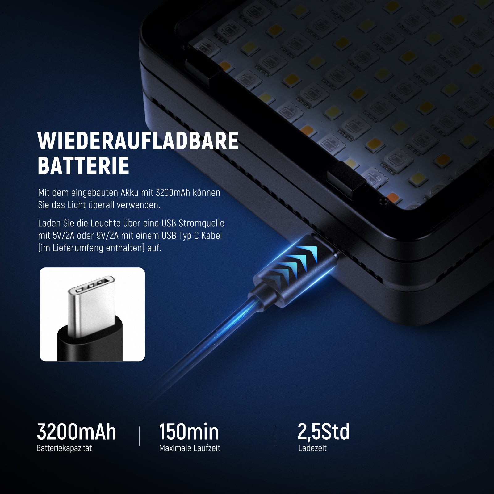 - 【Eingebauter 3200mAh Akku】 Verabschieden Sie sich von Ersatzbatterien. Der eingebaute 3200mAh Akku (7,4V/23,68W) sorgt für kabellose Stromversorgung und stabile Beleuchtung, egal wo Ihr Projekt stattfindet: sei es Outdoor Fotografie, Reise Vlogging oder Videografie für TikTok/YouTube. Verwenden Sie das mitgelieferte USB Typ C Kabel, um die Leuchte über ein Wandladegerät mit 5V/2A oder 9V/2A Ausgang aufzuladen