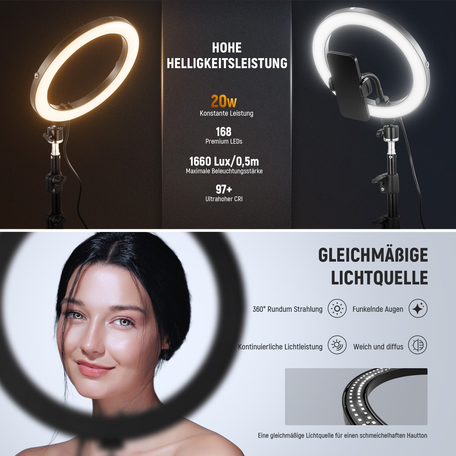 - 20W zweifarbiges Ring Licht- Ein 20W leistungsstarkes Kreisringlicht als Haupt oder Fülllicht für Make up, Wimpernverlängerung für Kosmetikerinnen, Tätowierungen, Videoaufzeichnungsbeleuchtung, Live Streaming von Streamern, Zoom Anrufe am Computer, Fotoshootings, Selfies und zum Filmen von TikTok Sozialen Medien Vlogs. 168 LEDs (84 kaltweiß und 84 warmweiß), 0–100% Dimmen, 1660 LX/0,5m Beleuchtungsstärke und CRI 97+/TLCI 98+ erzeugen eine helle oder weiche, diffuse und gleichmäßige Lichtquelle