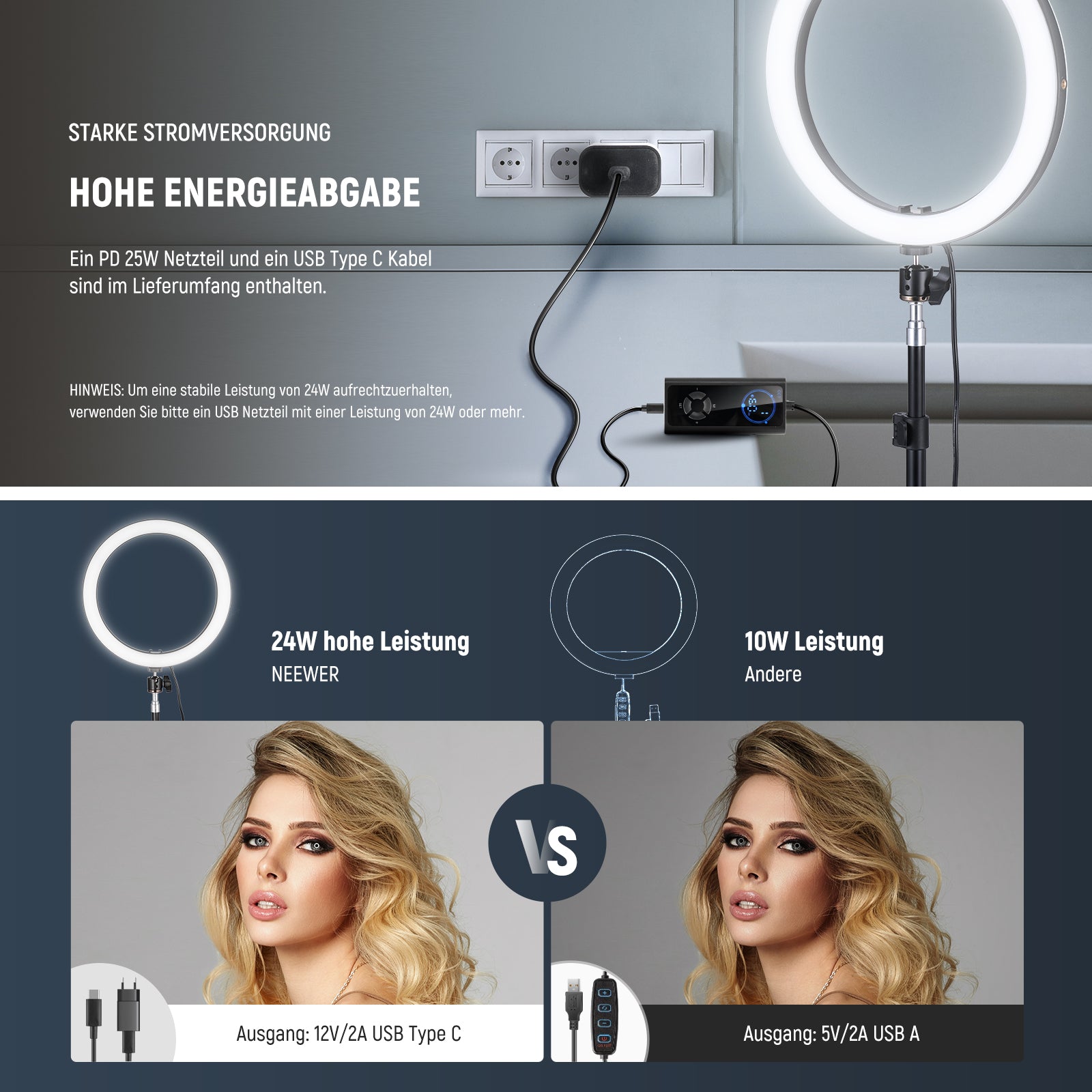 - PD 24W USB Typ C Eingang- Schließen Sie das Ring Leuchte über das mitgelieferte USB Netzteil und das USB Typ C Kabel an eine Steckdose an, um eine bequeme Stromversorgung zu gewährleisten. Das Netzteil unterstützt PD 24W Eingang für hohe Energie