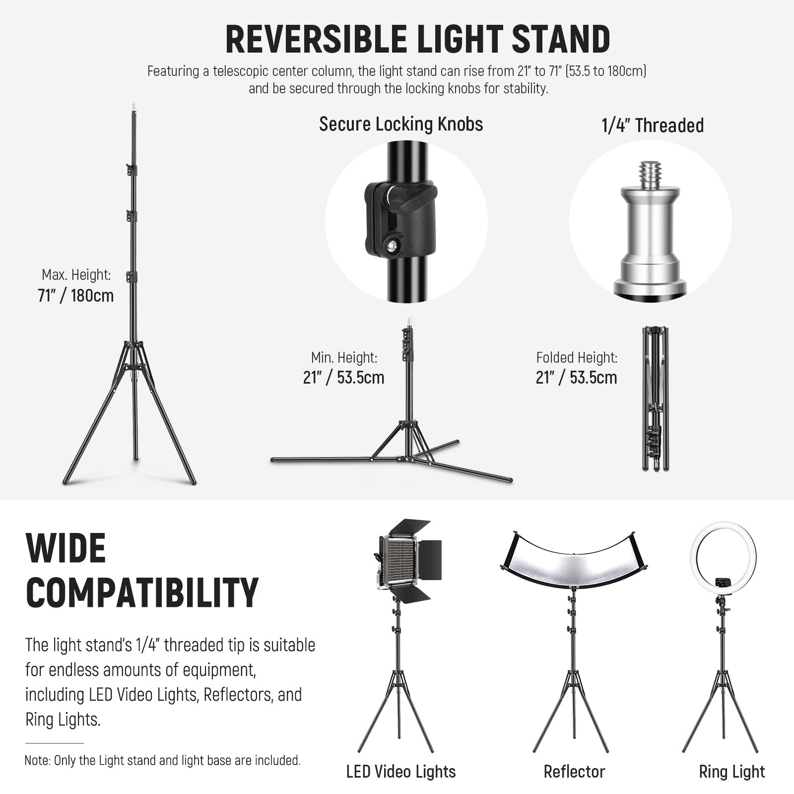- 【Umkehrbares zusammenklappbares Lichtstativ】 Das umkehrbare Lichtstativ mit 3 Teleskopabschnitten kann für unterschiedliche Höhenanforderungen auf 180cm (6 Fuß) ausgefahren werden und für einfache Lagerung und Transport auf eine kleine Größe zusammengeklappt werden