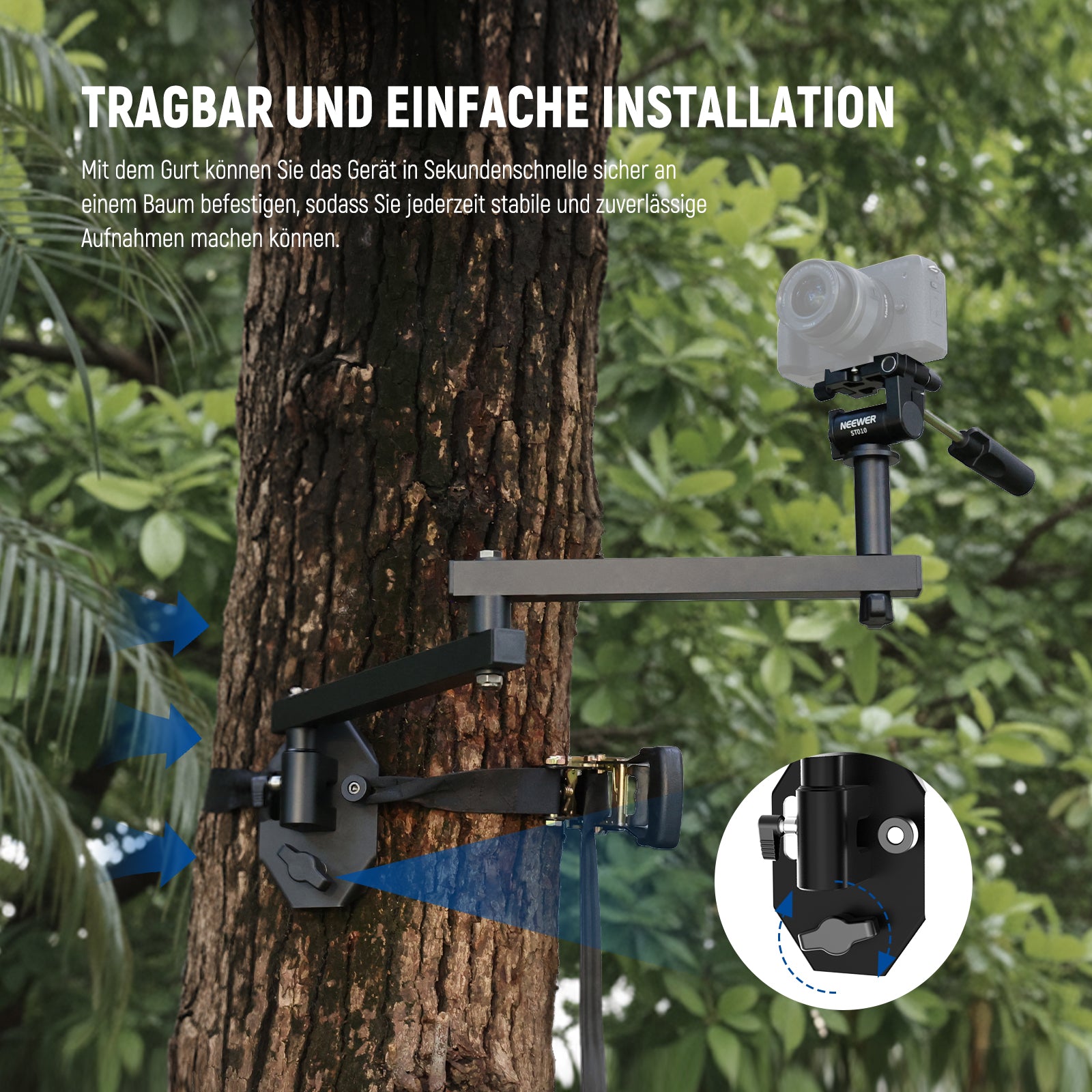 - Tragbar und einfach zu installieren- NEEWER ST010 ist ein faltbarer und leichter Outdoor-Kamerarm (nur 2 kg), einfach zu verstauen und zu transportieren für Jagdpartien, Abenteuer im Freien und Tierdreharbeiten. Der robuste Gurt ermöglicht es, es in Sekundenschnelle sicher an einem Baum zu befestigen und garantiert jedes Mal stabile und zuverlässige Aufnahmen.